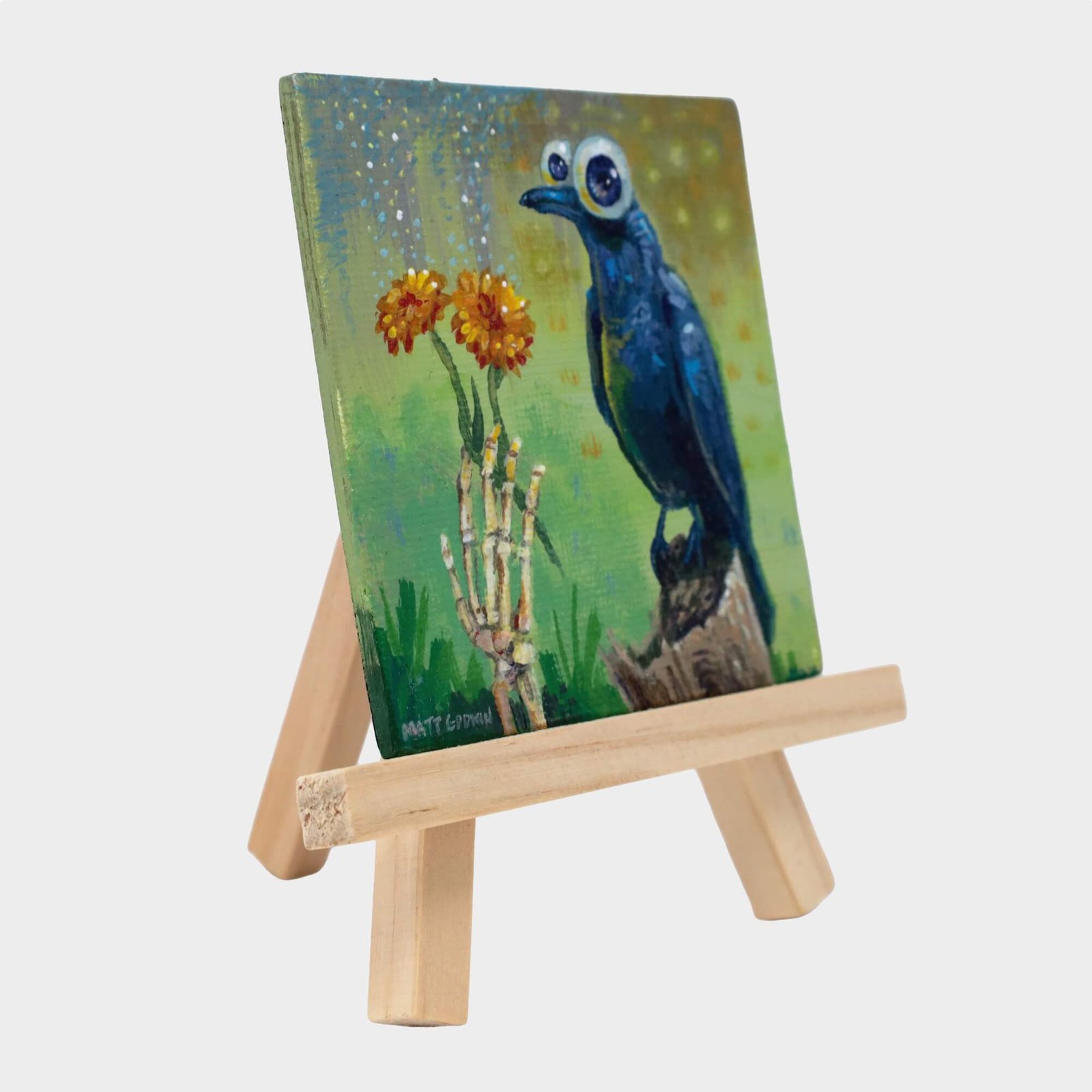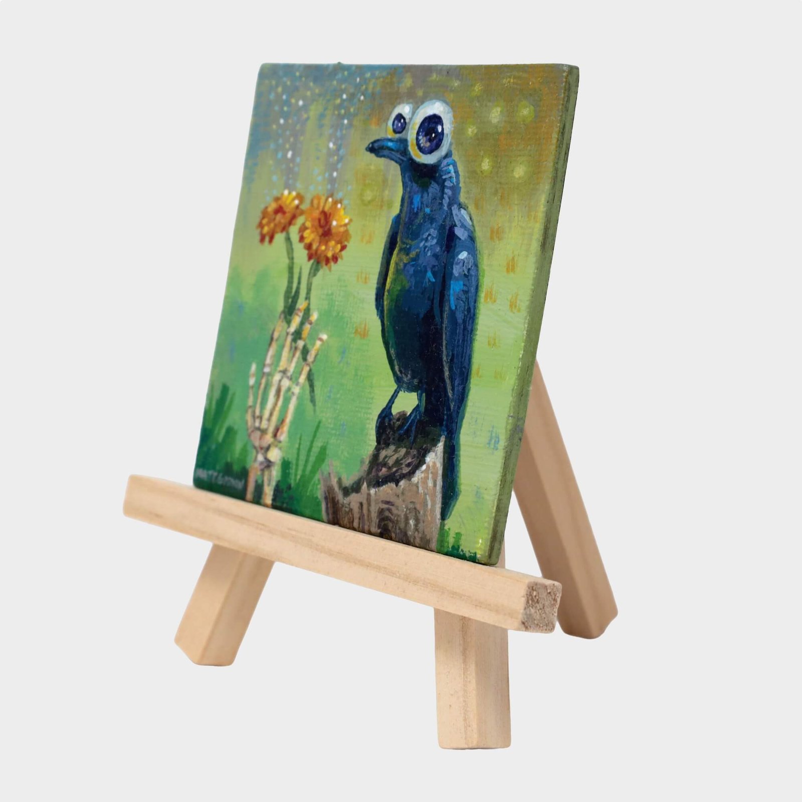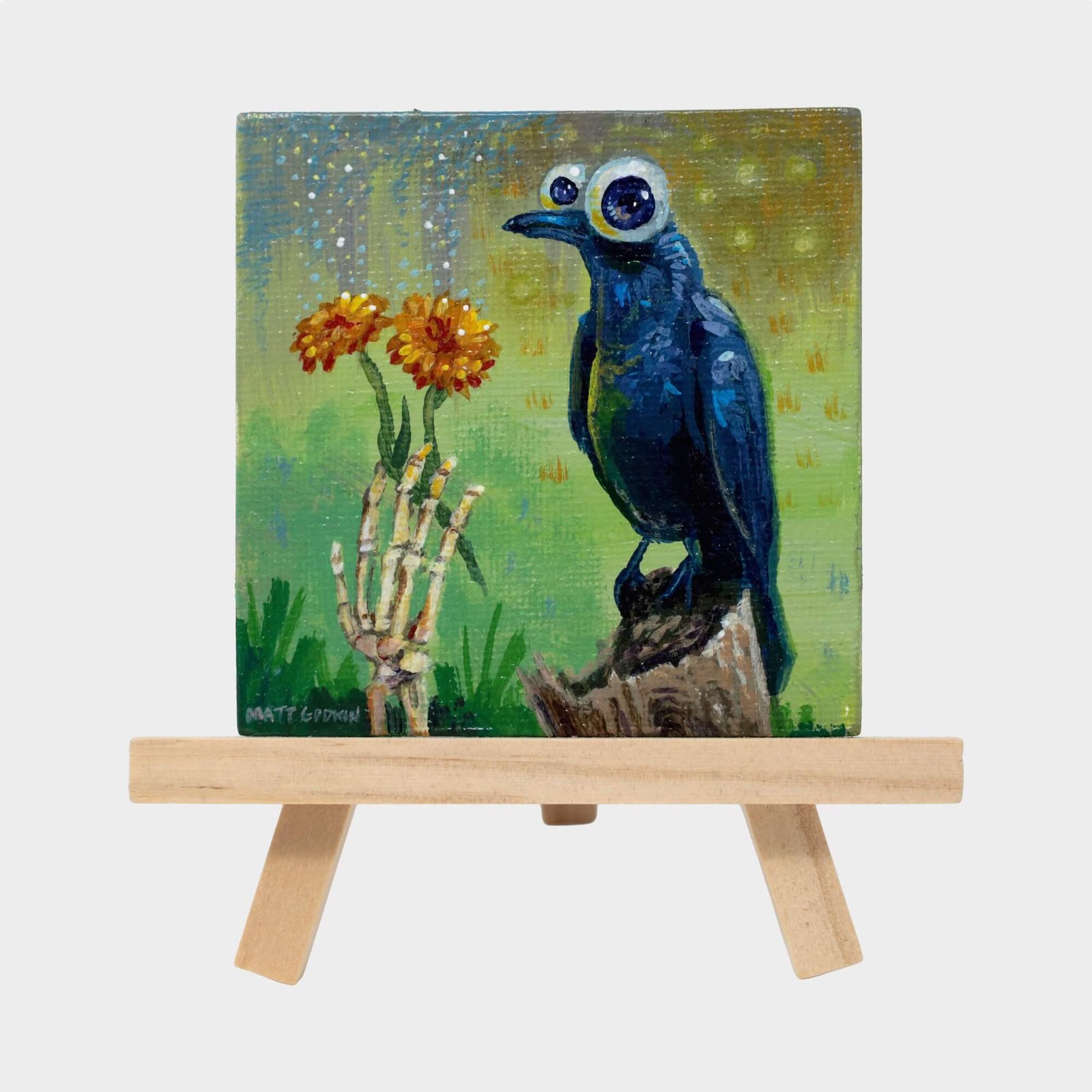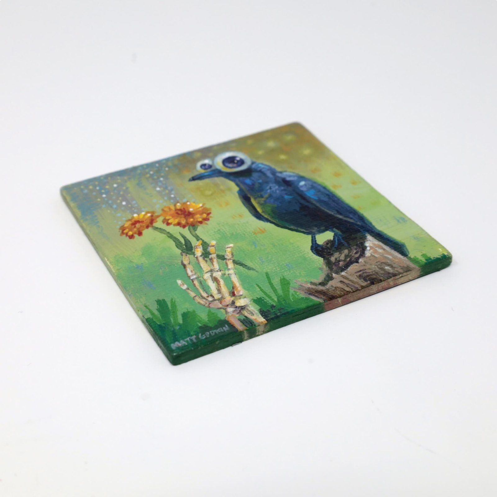 “Crow Magnet” original acrylic painting on magnetic canvas panel by Matt Godwin 3″x3″