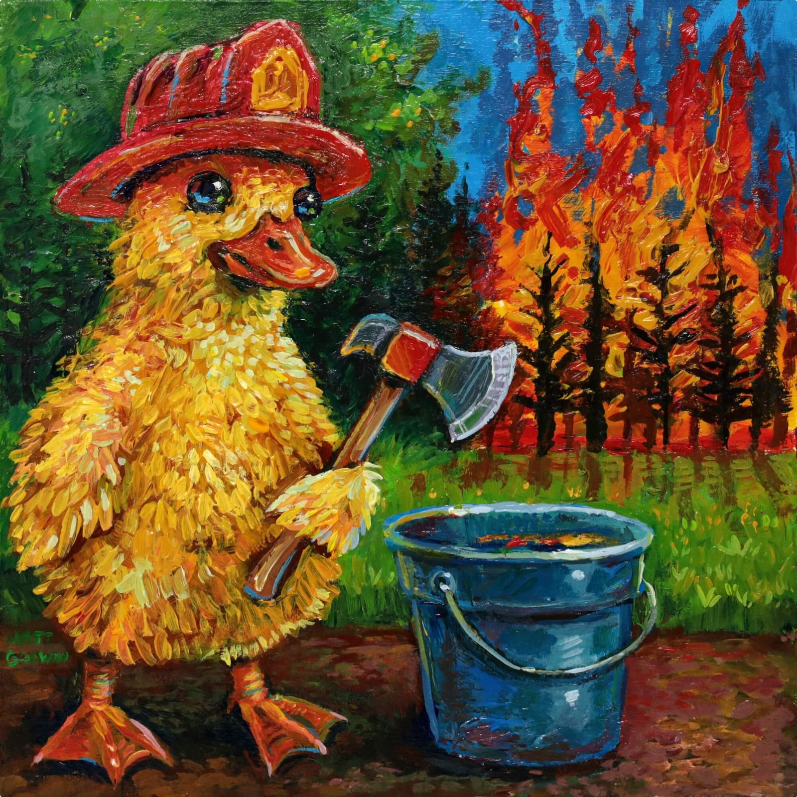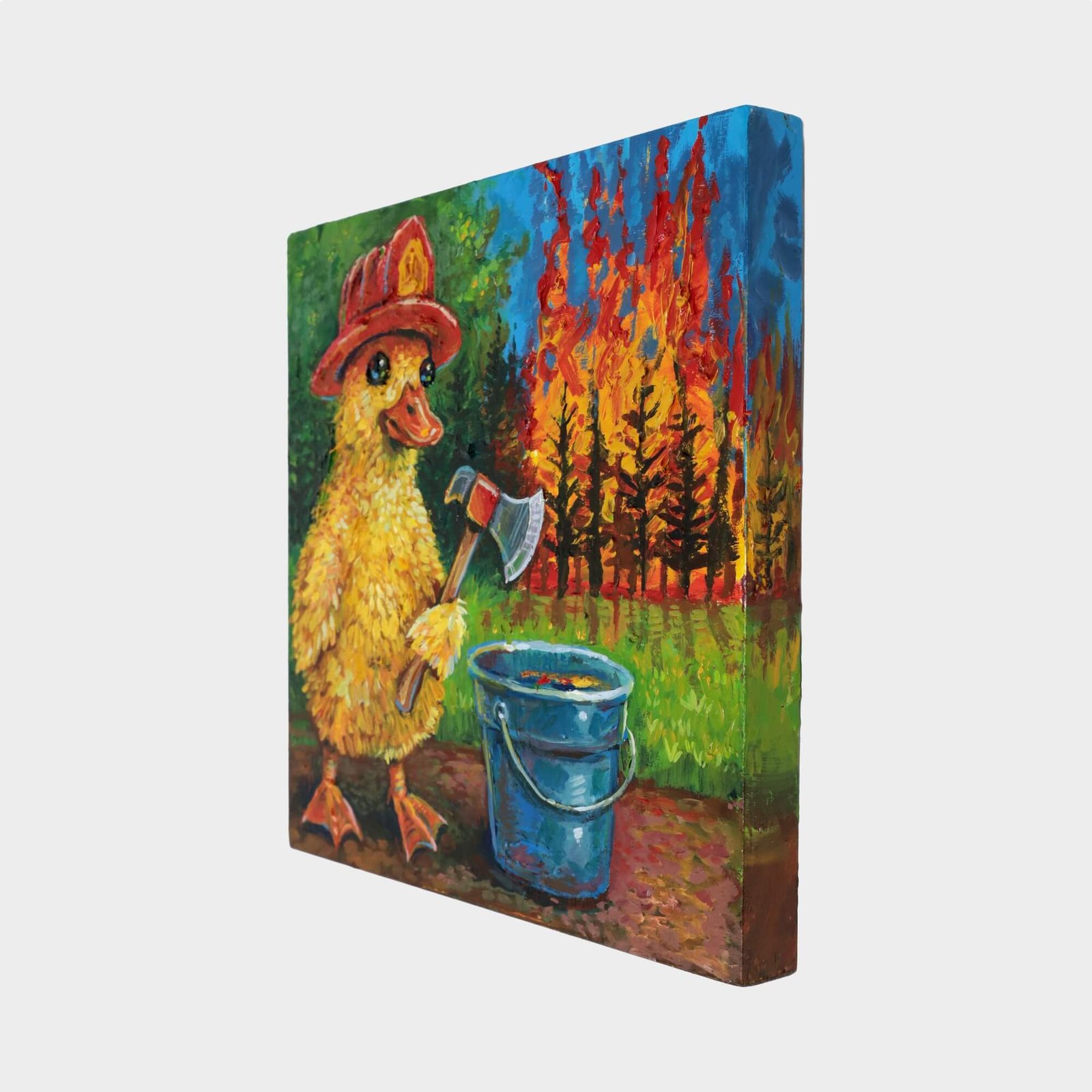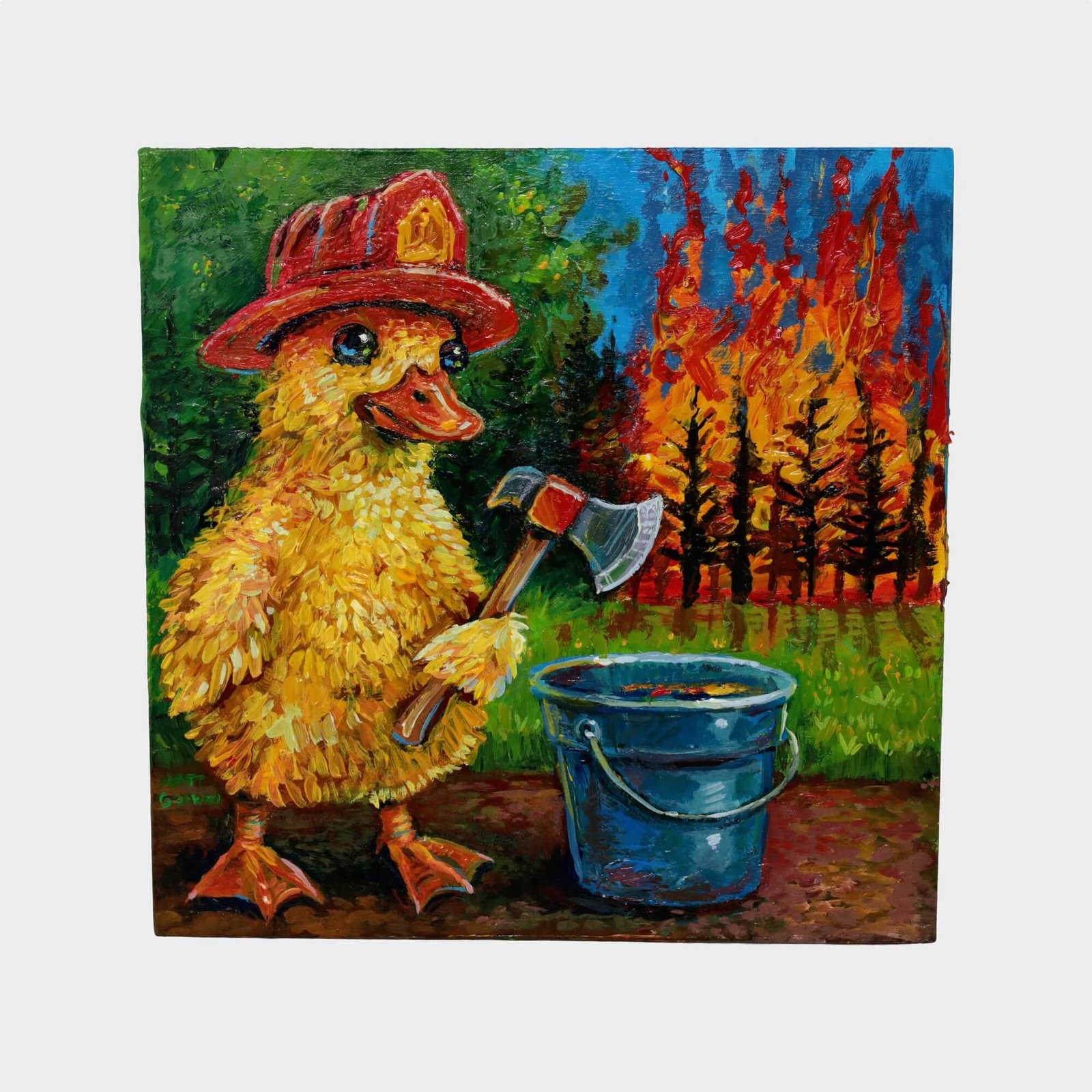 “Duckling Firefighter (Impasto Version)” original acrylic painting on wood by Matt Godwin 8″x8″