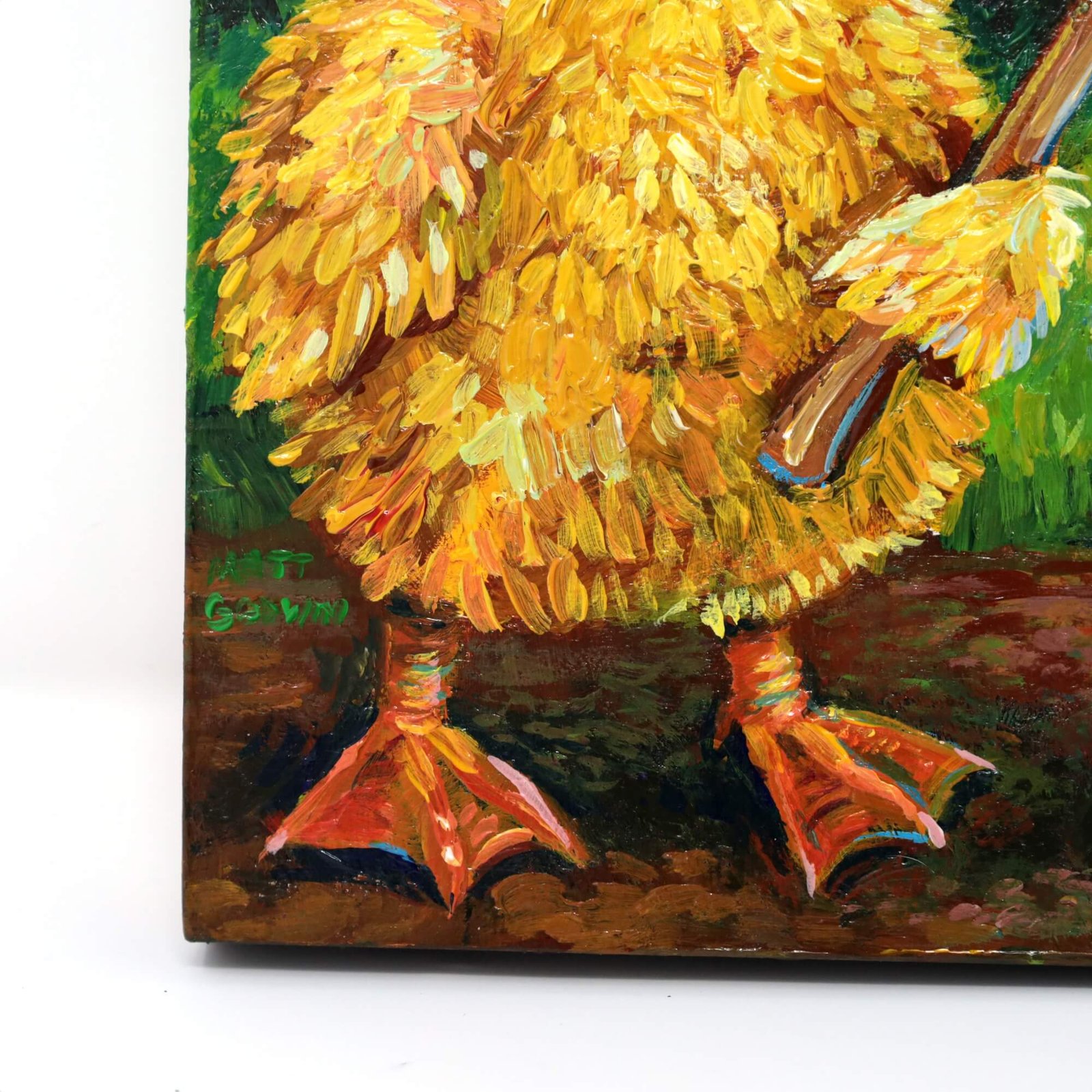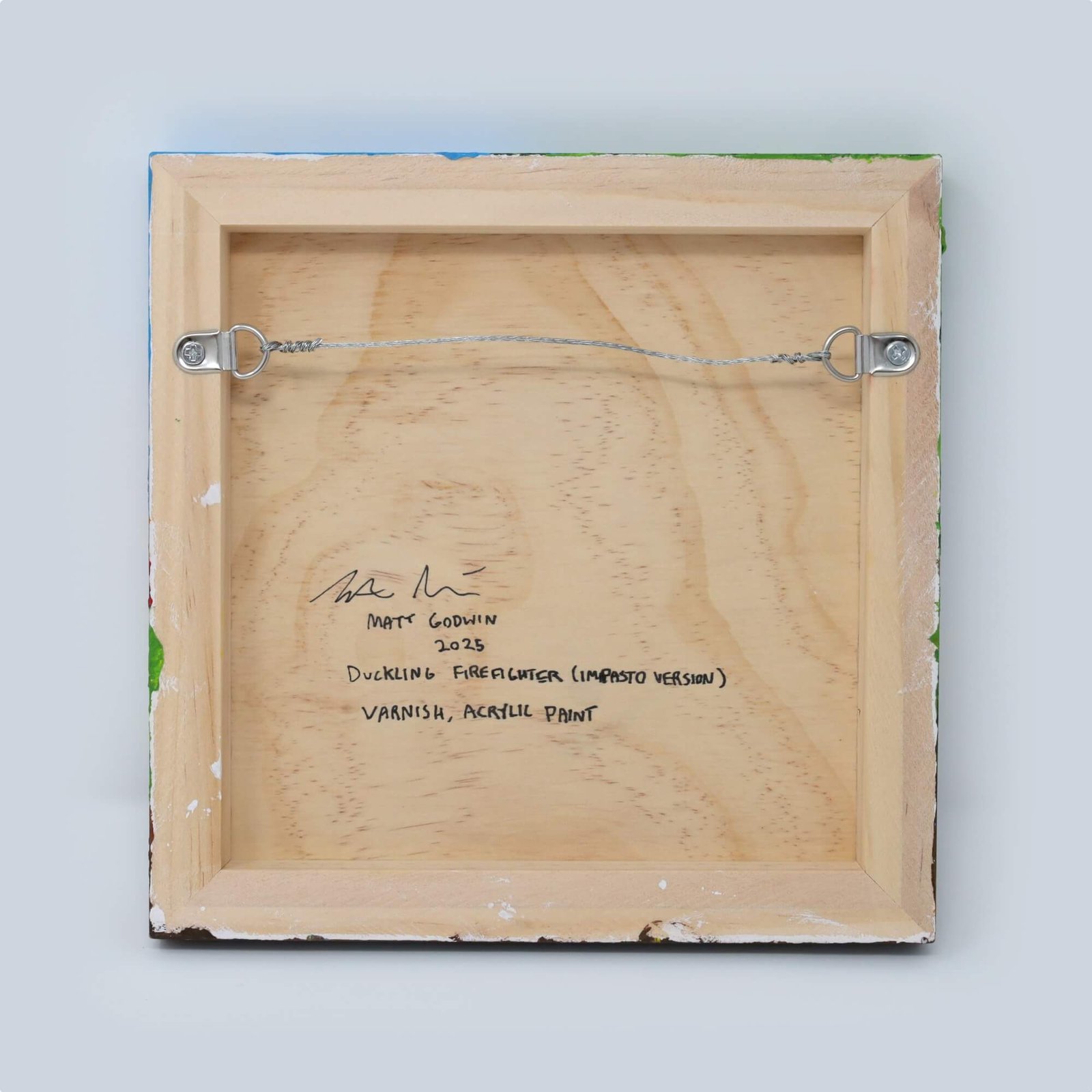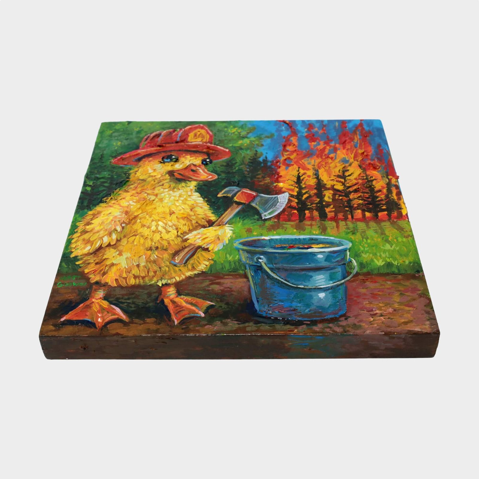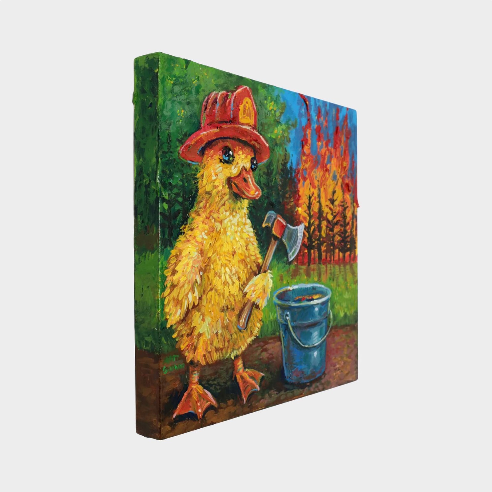“Duckling Firefighter (Impasto Version)” original acrylic painting on wood by Matt Godwin 8″x8″