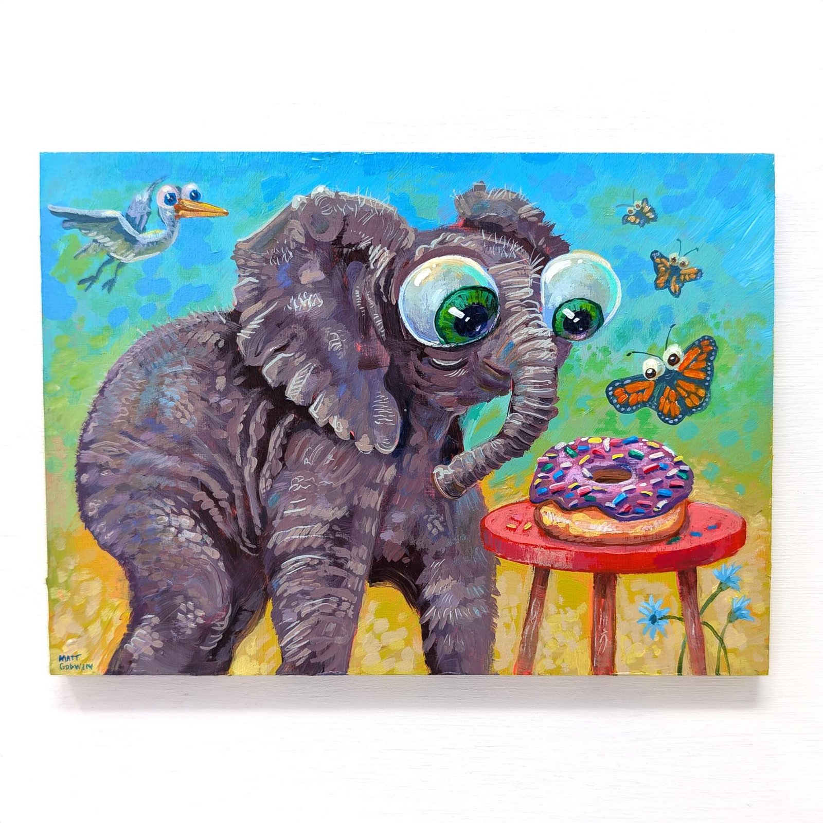 “Elephant Donut Lover” original acrylic painting on wood by Matt Godwin 7″x5″