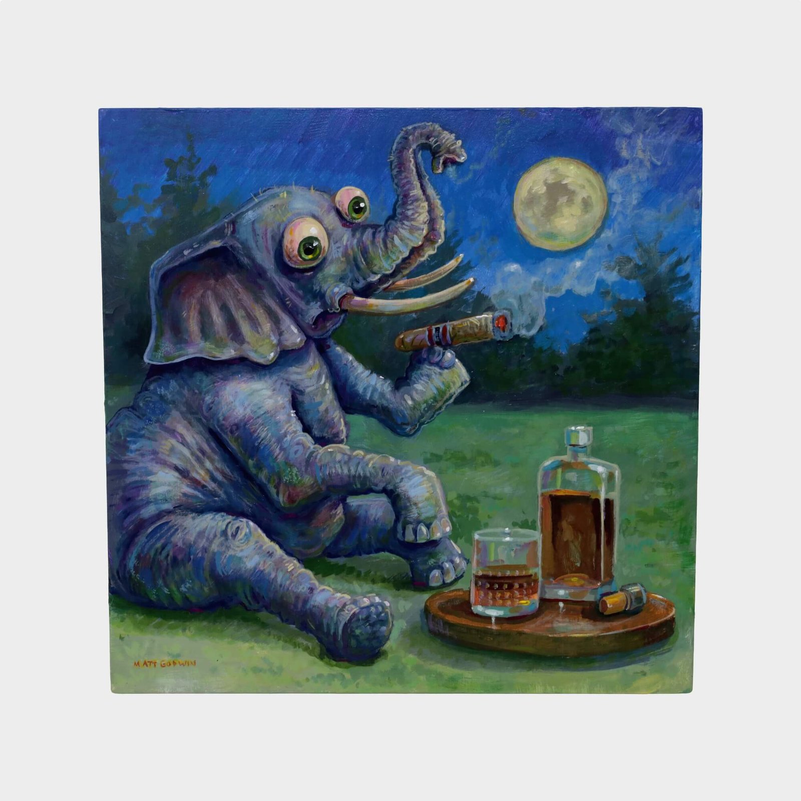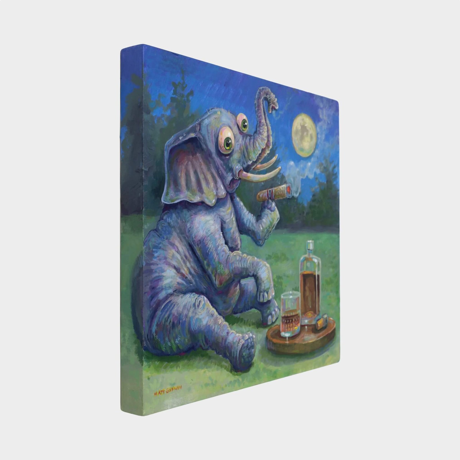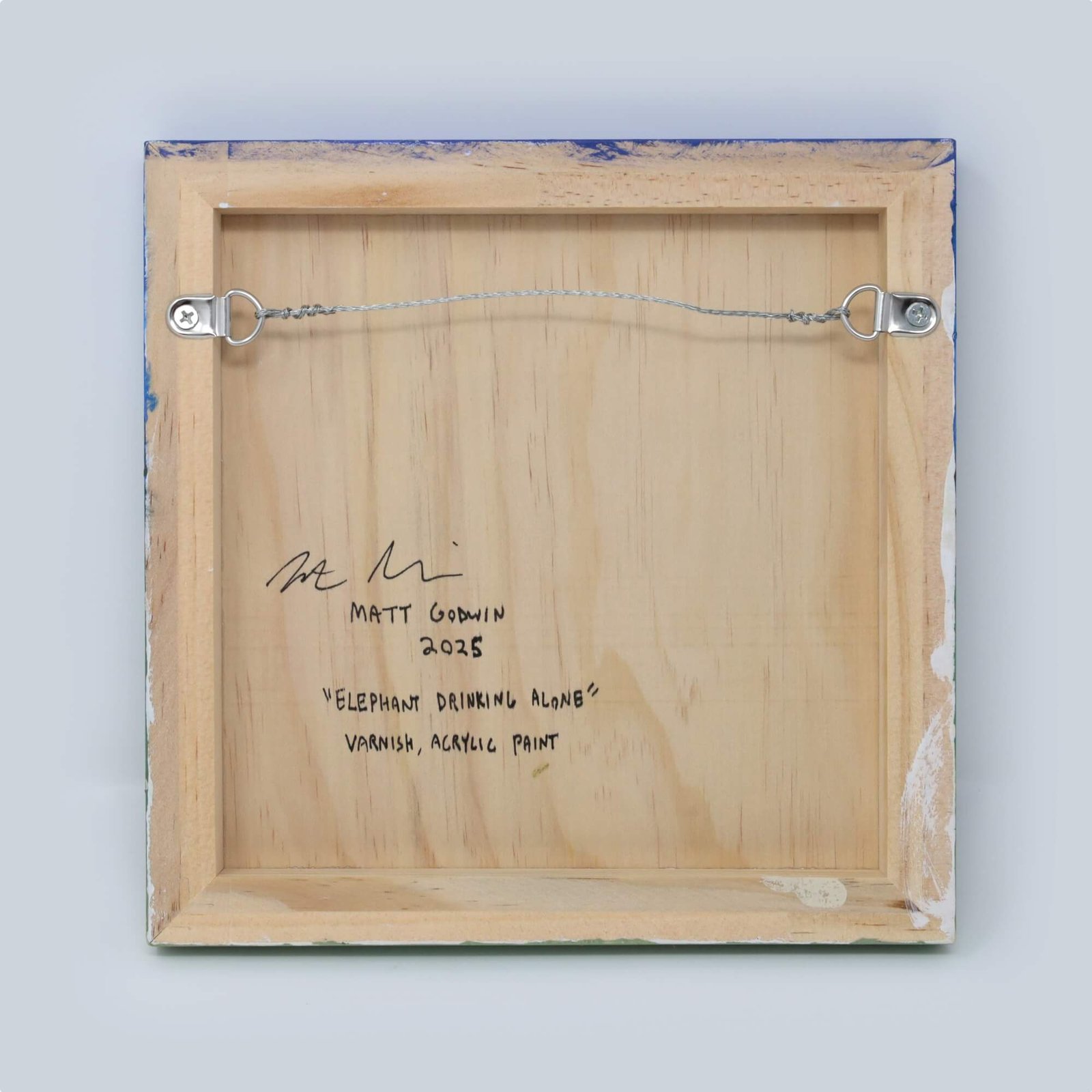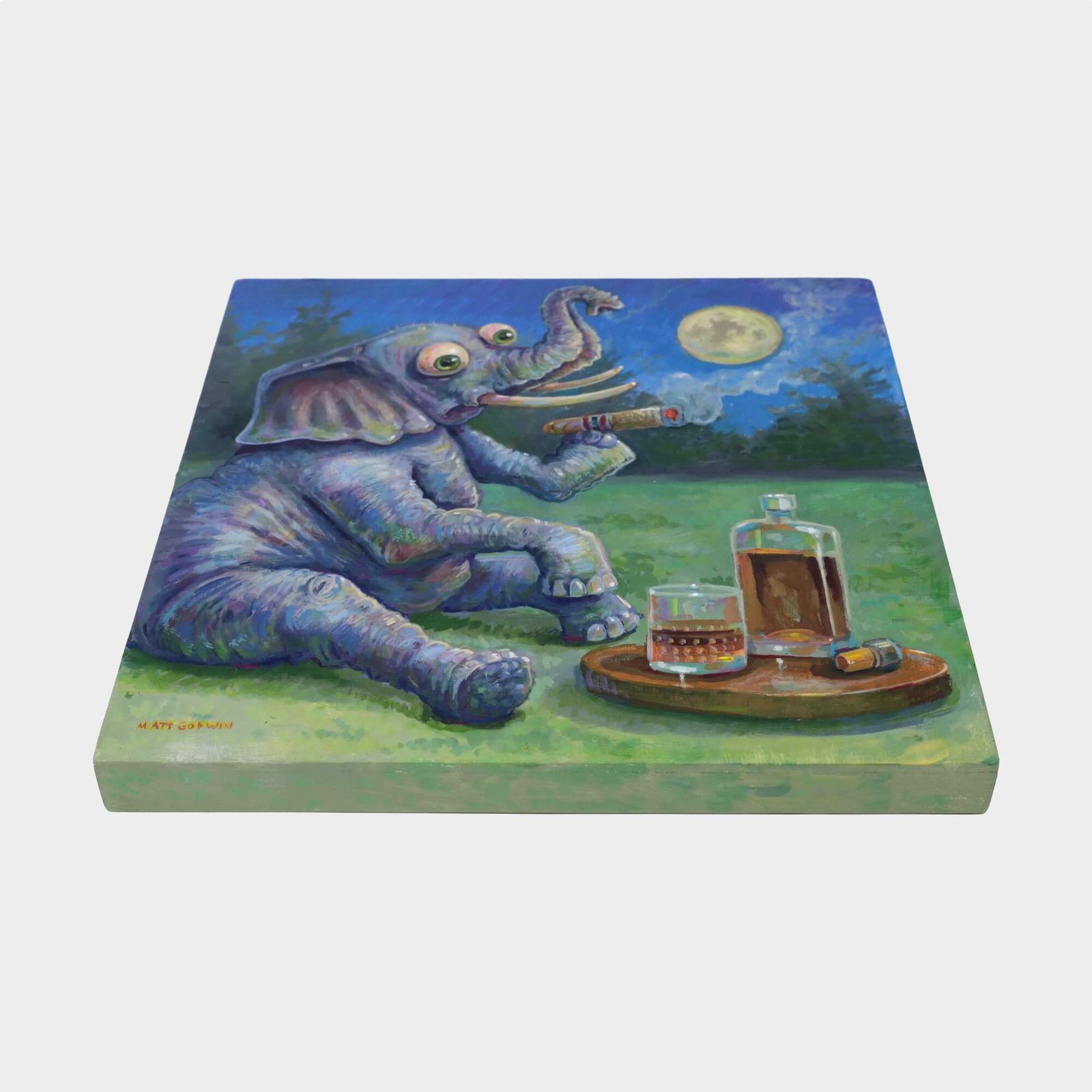 “Elephant Drinking Alone” original acrylic painting on wood by Matt Godwin 8″x8″