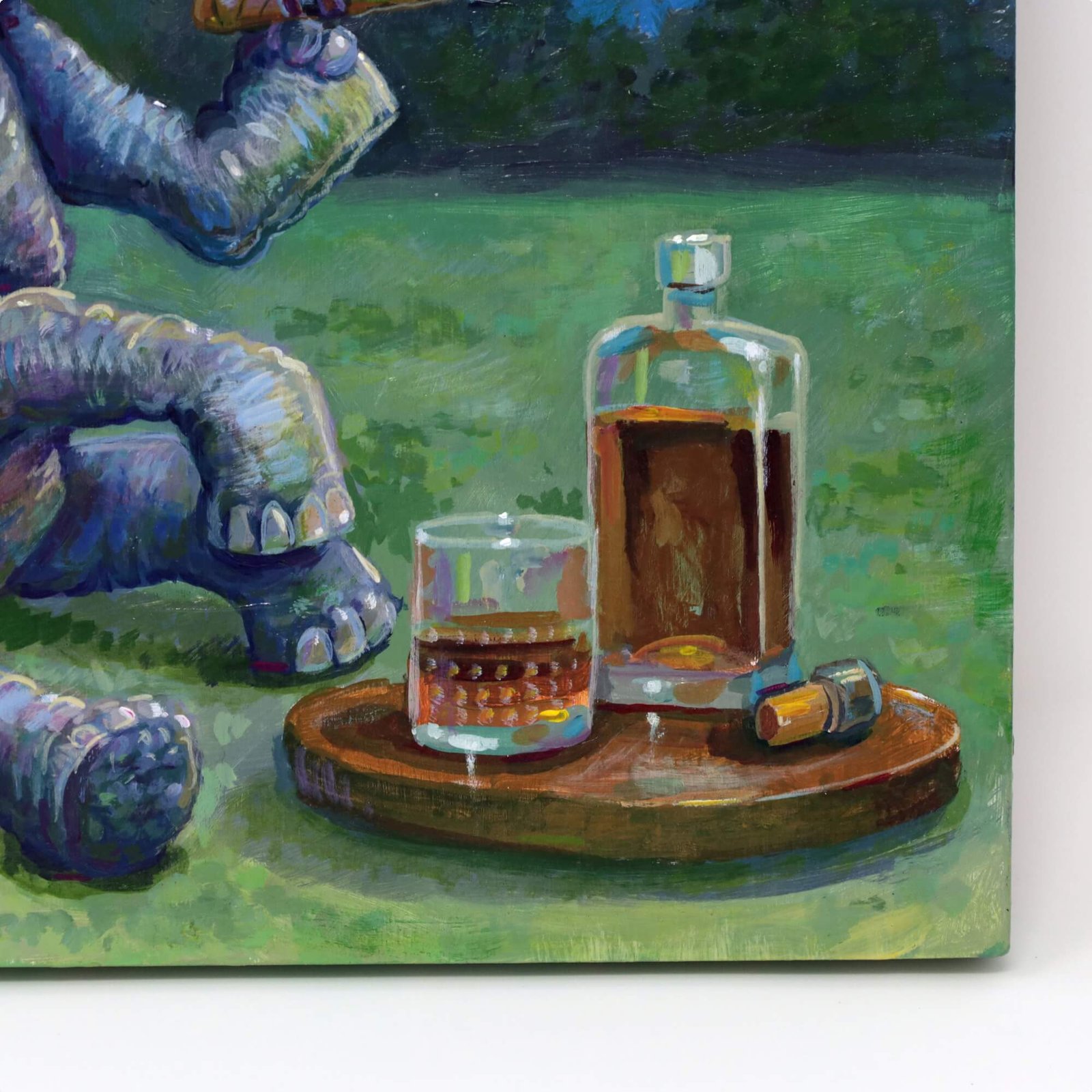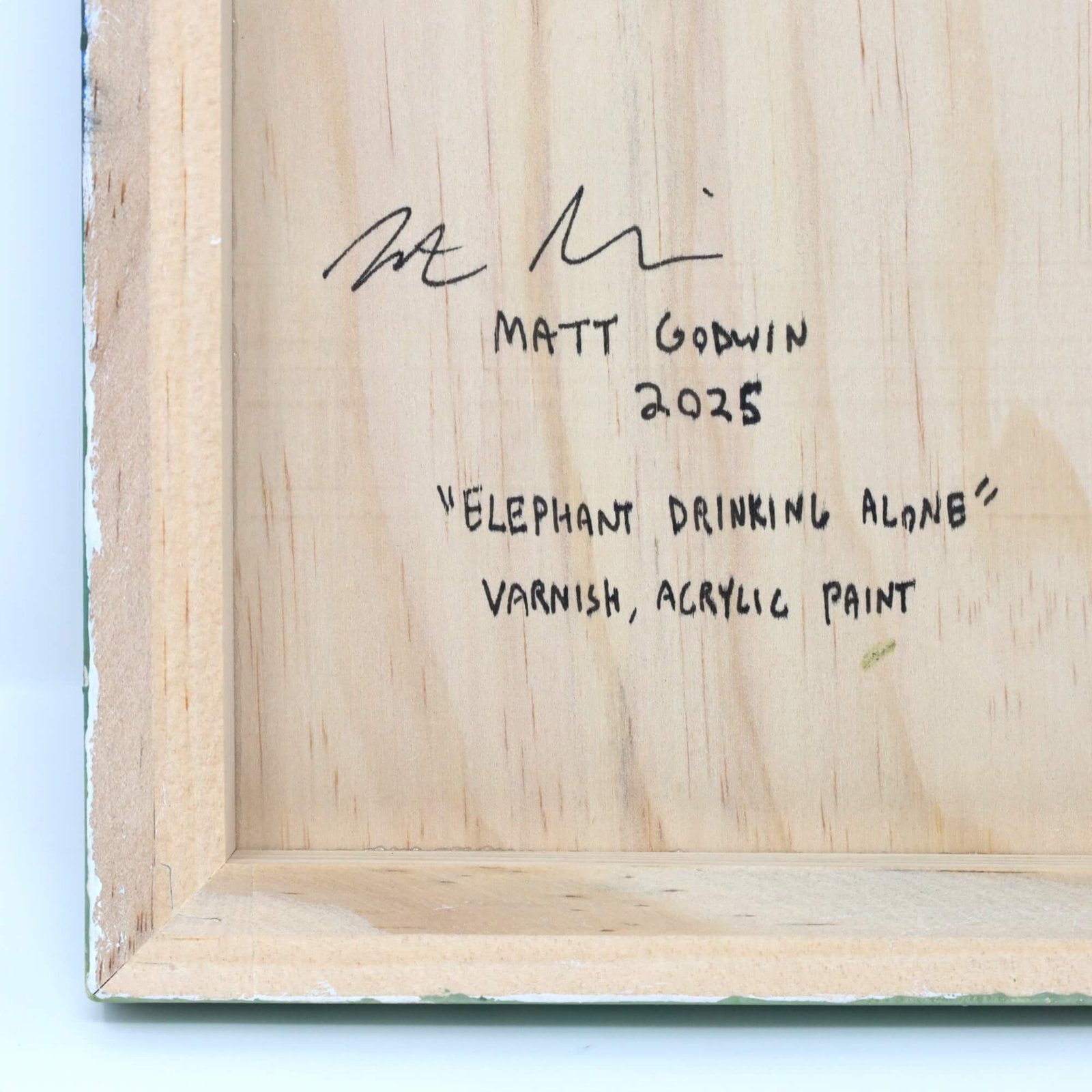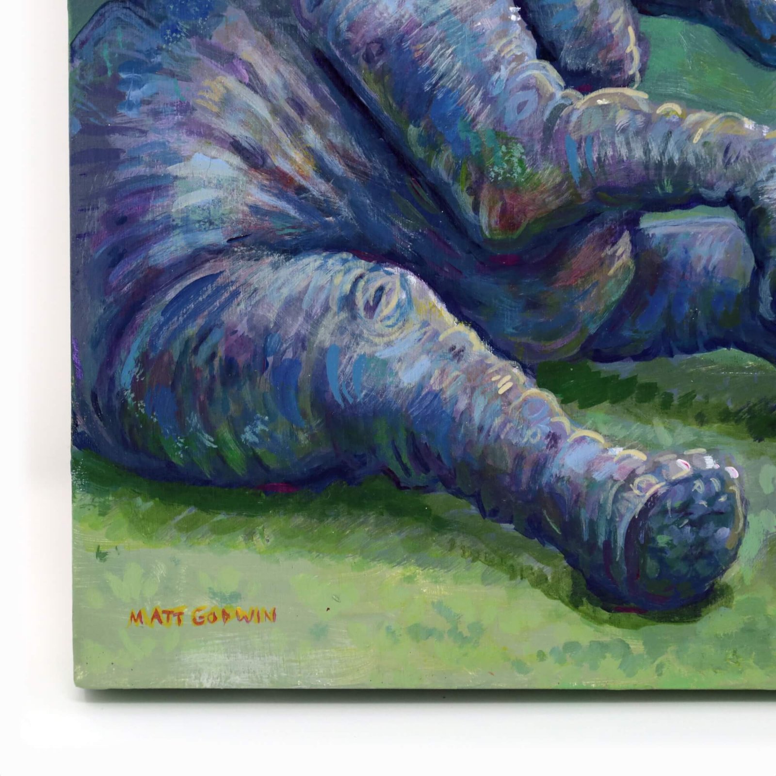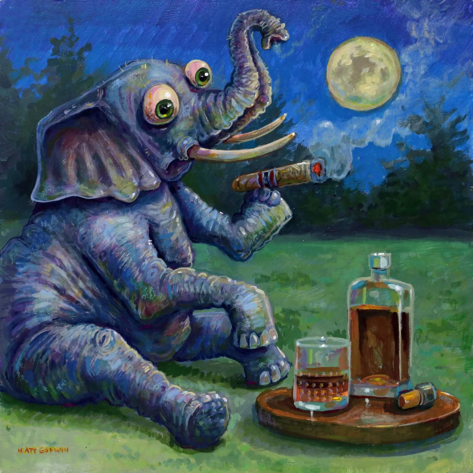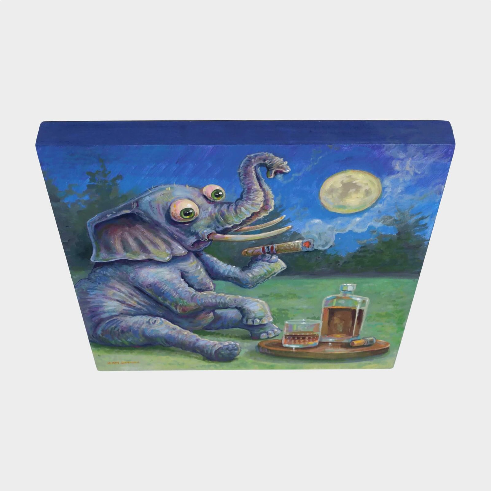 “Elephant Drinking Alone” original acrylic painting on wood by Matt Godwin 8″x8″
