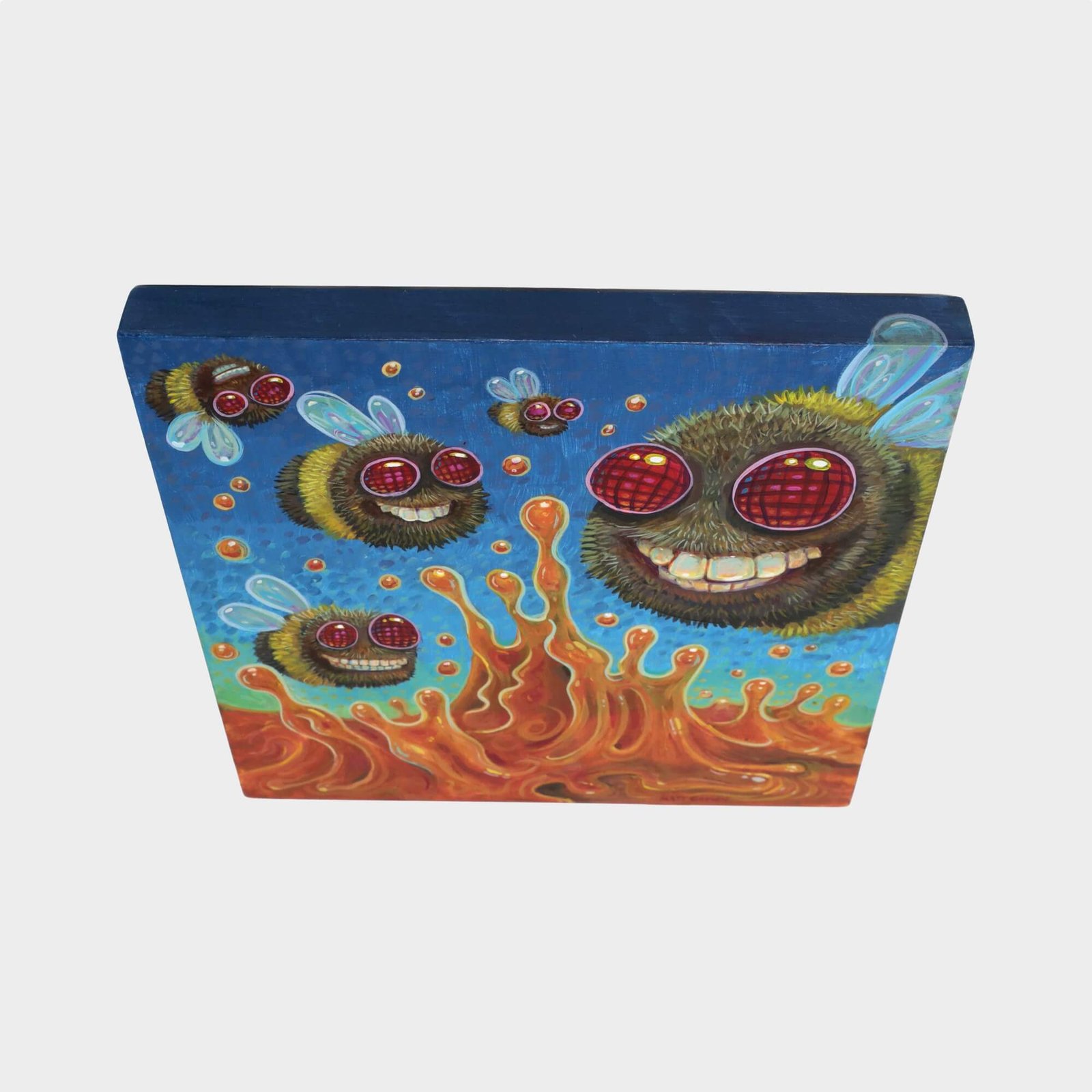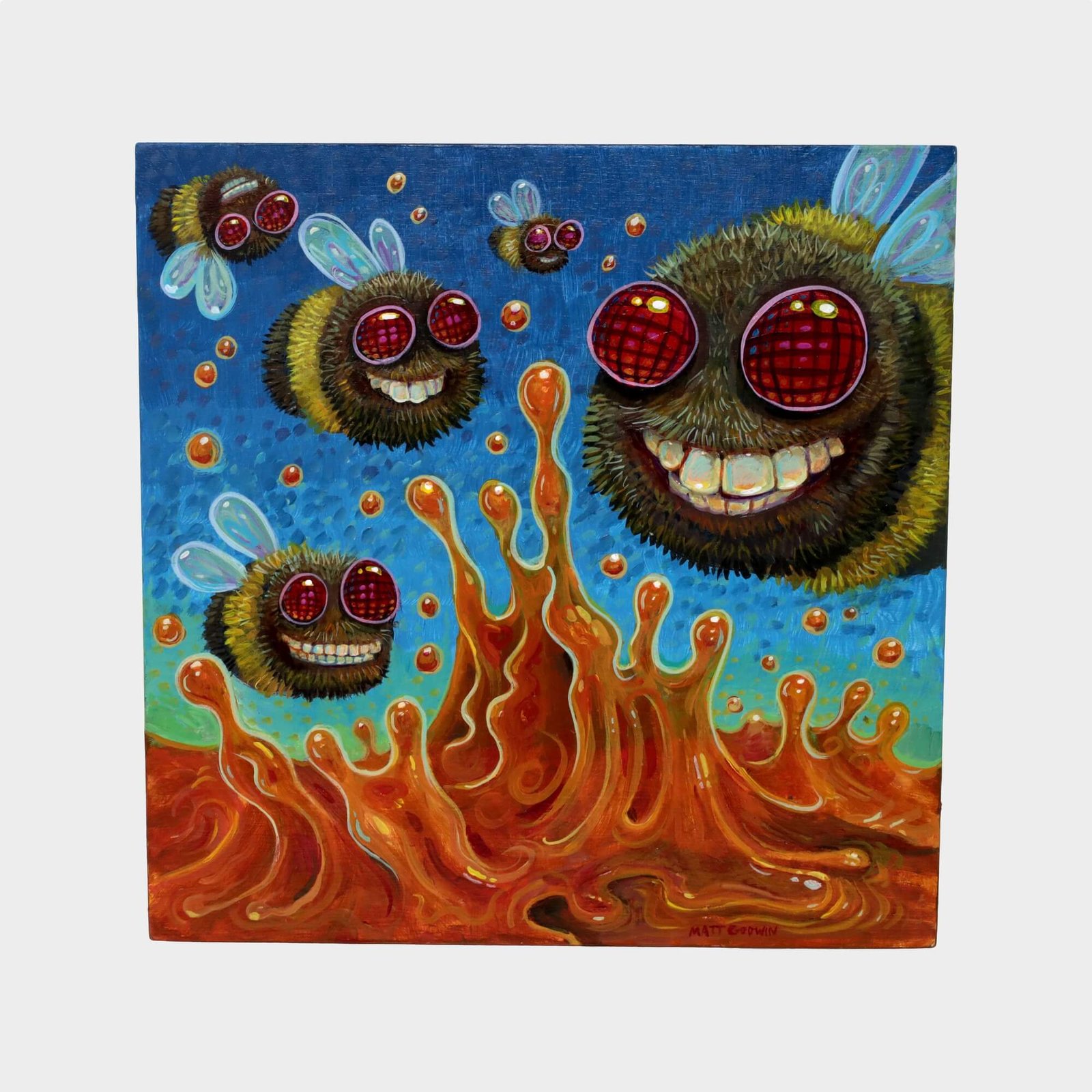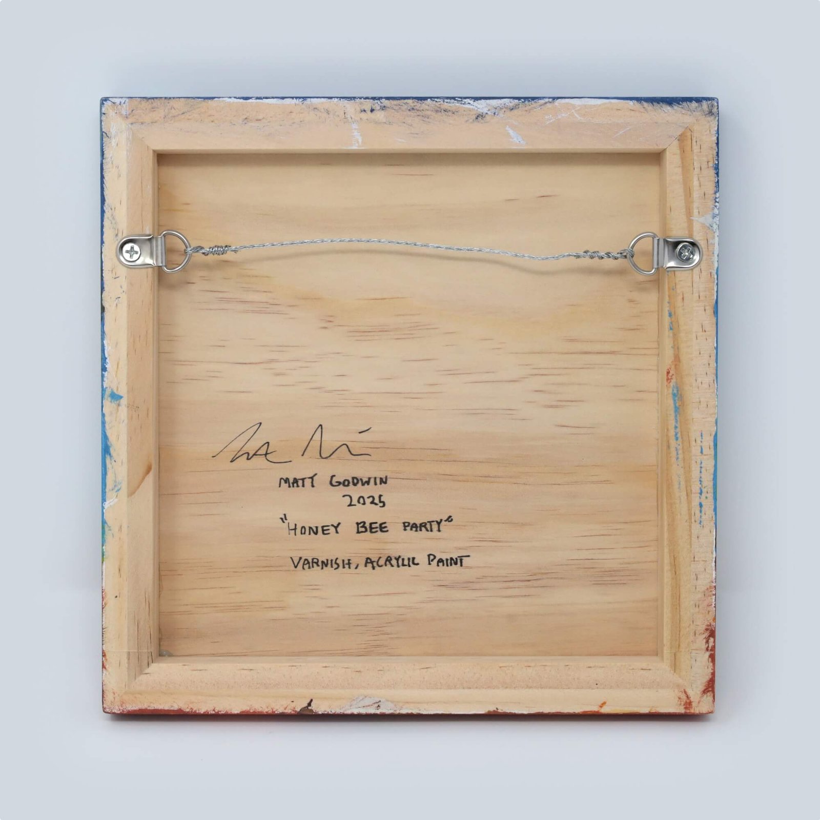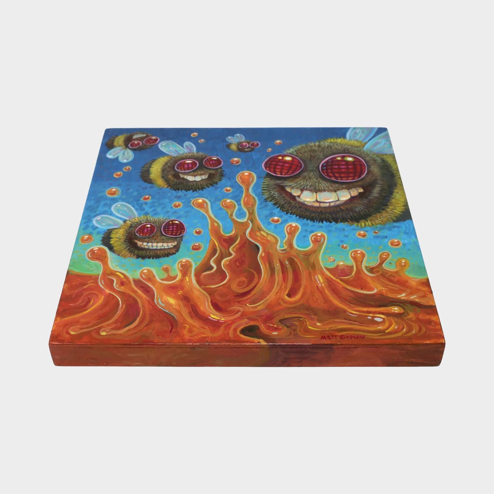 “Honey Bee Party” original acrylic painting on wood by Matt Godwin 8″x8″