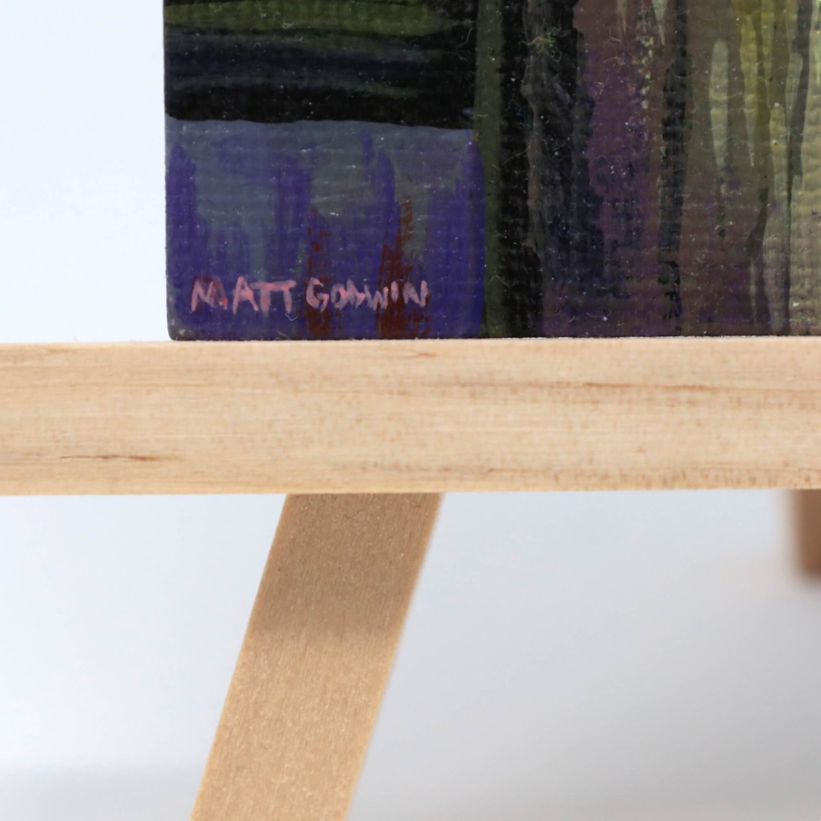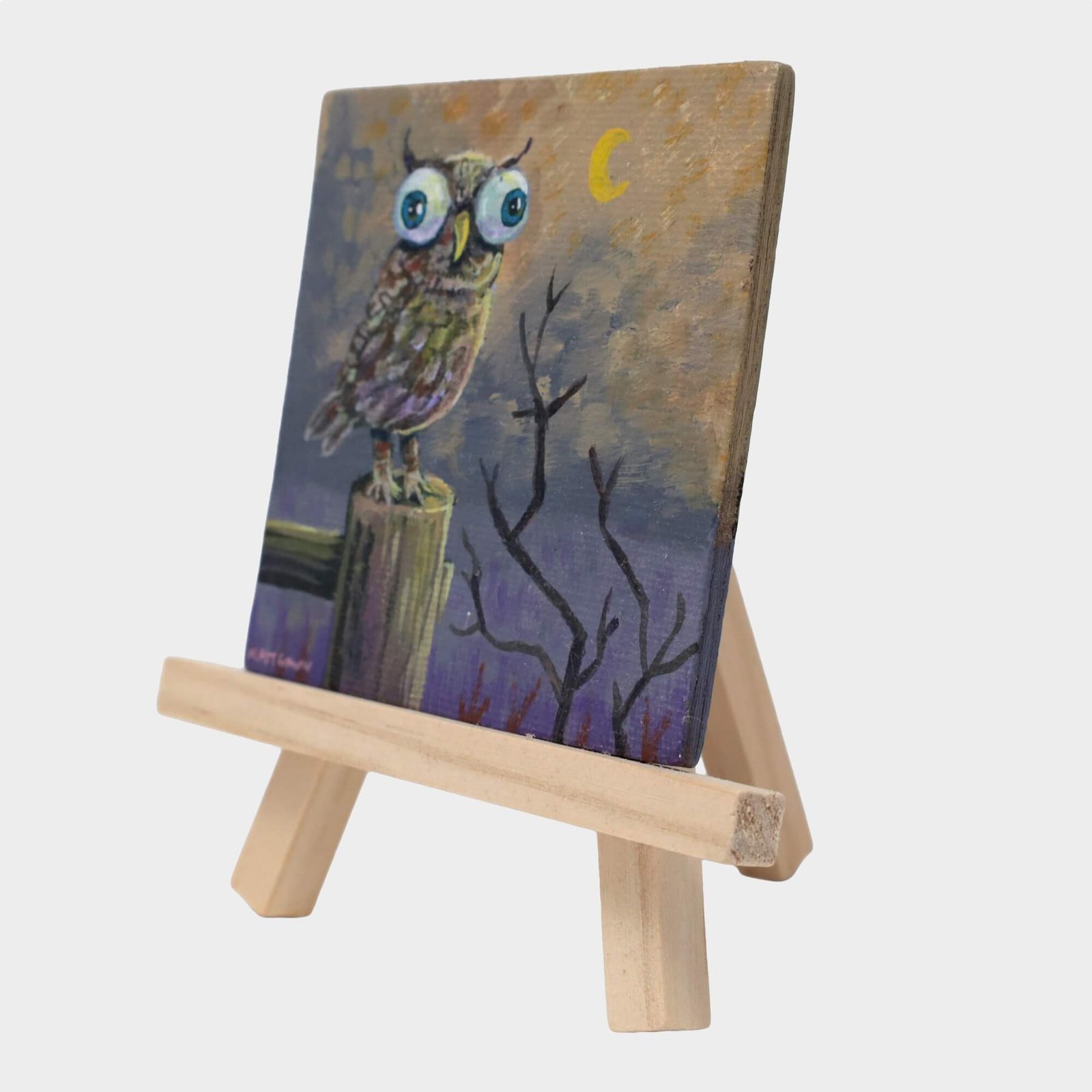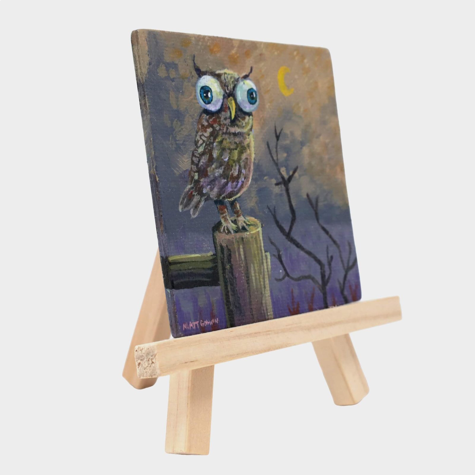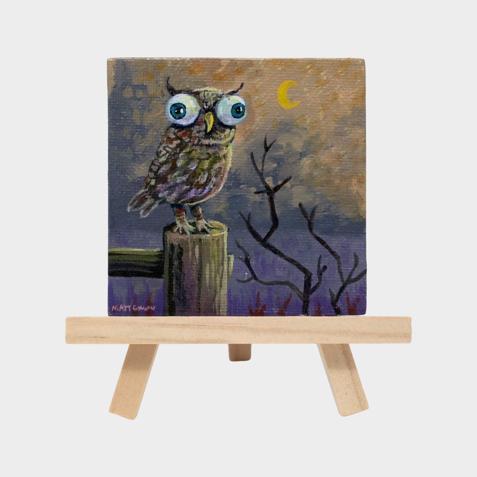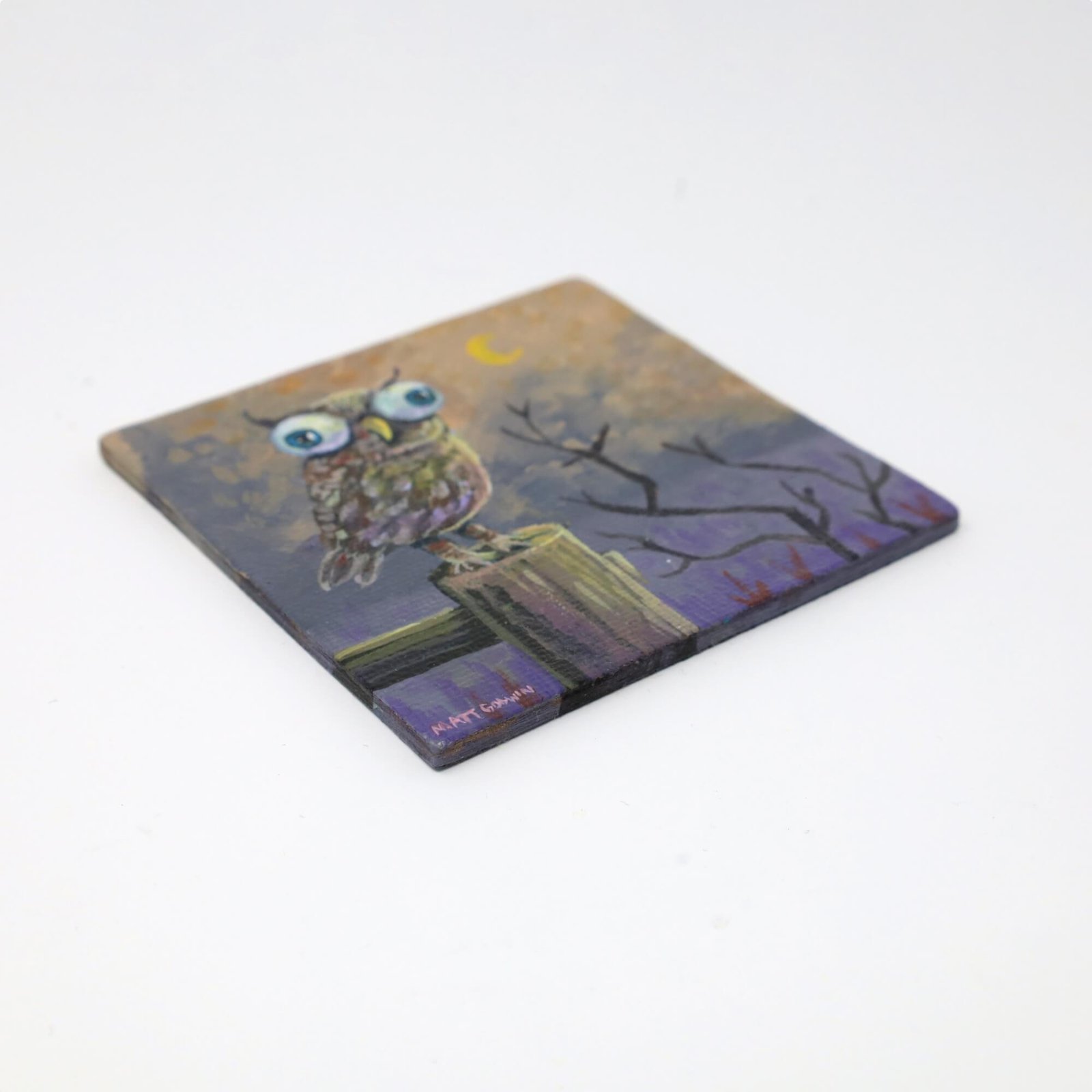 “Owl Magnet” original acrylic painting on magnetic canvas panel by Matt Godwin 3″x3″