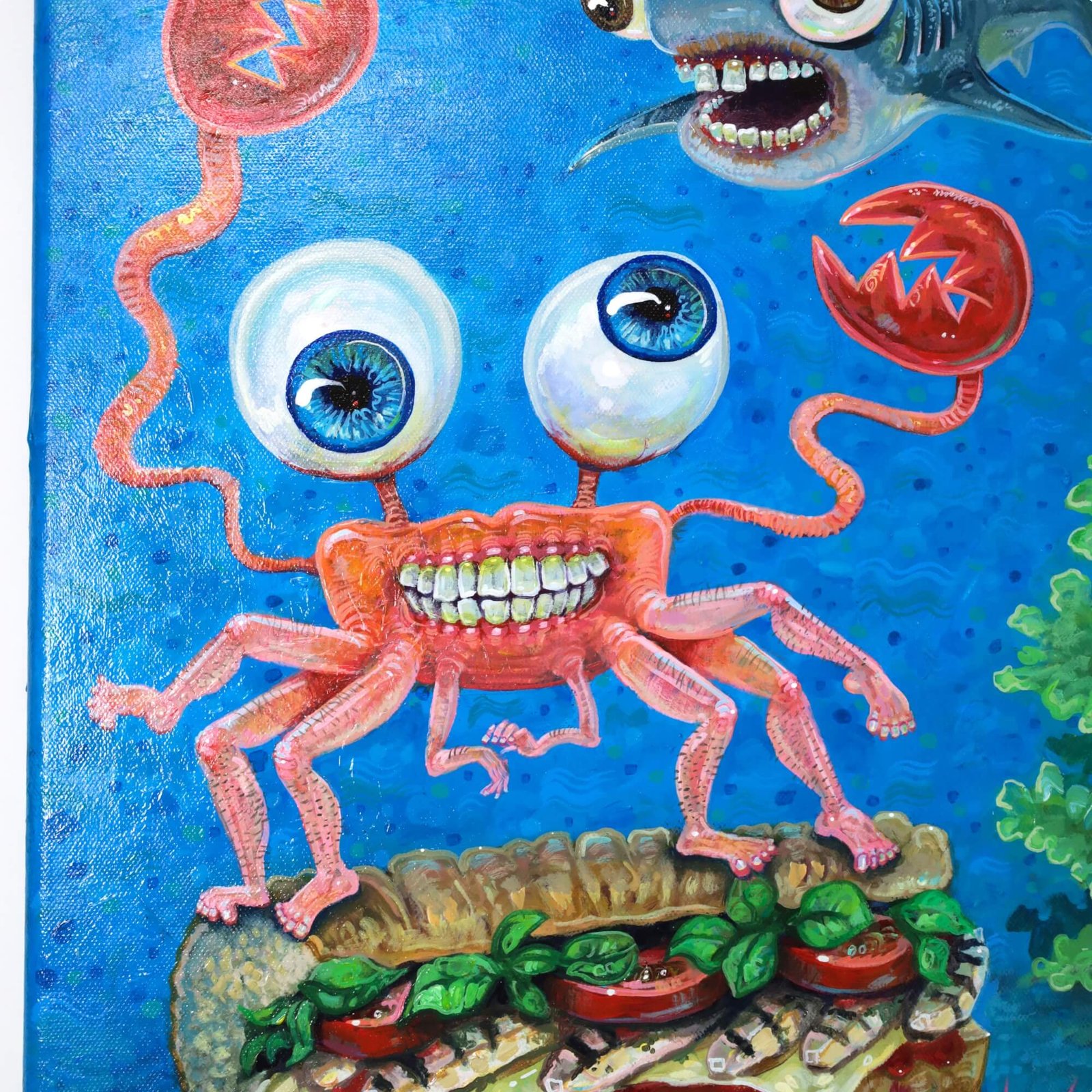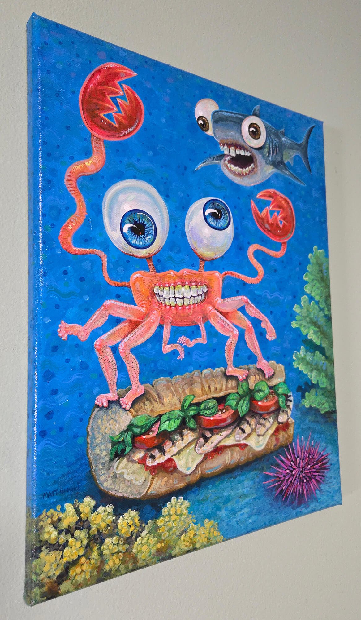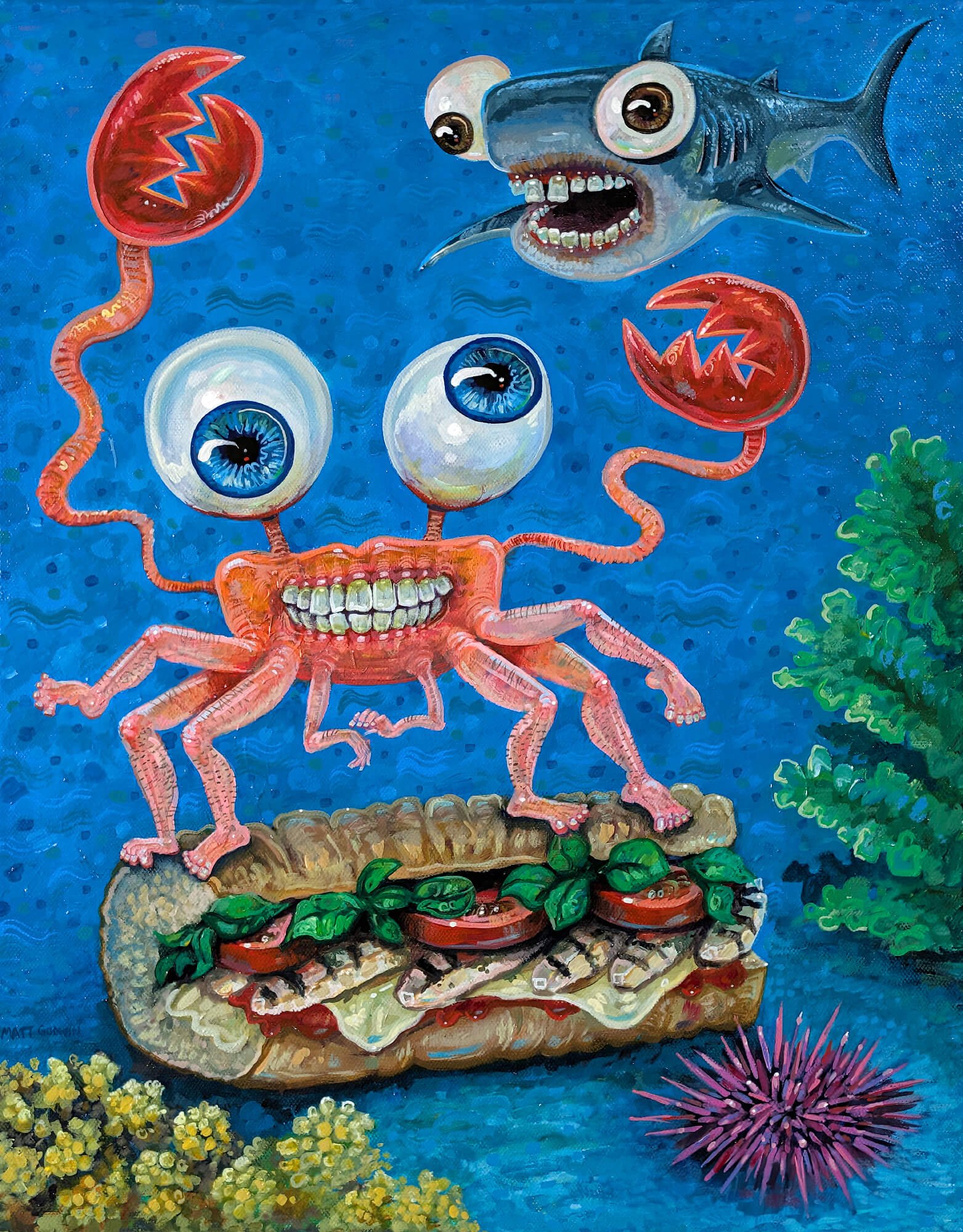 “Submarine Crab With Shark Friend” original acrylic painting on canvas by Matt Godwin 14″x18″ Load Listing