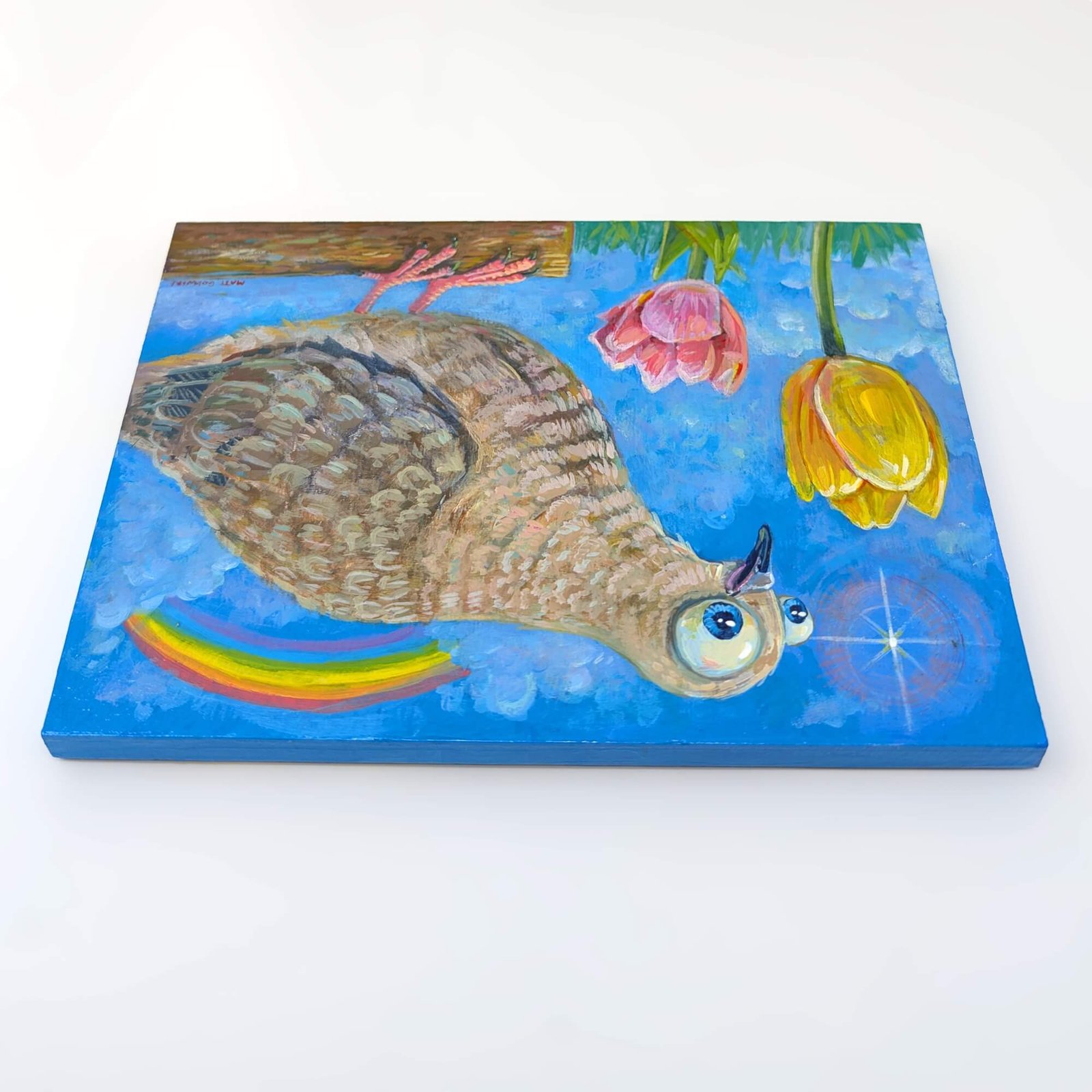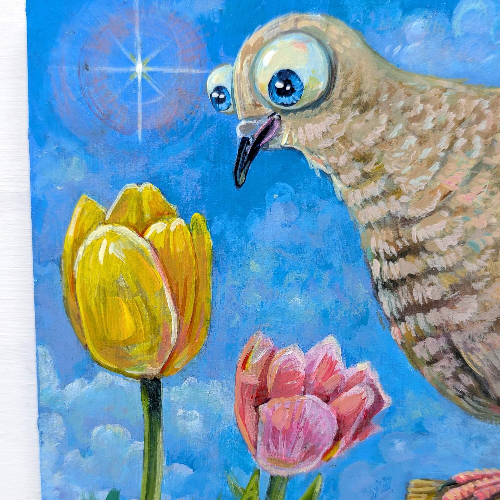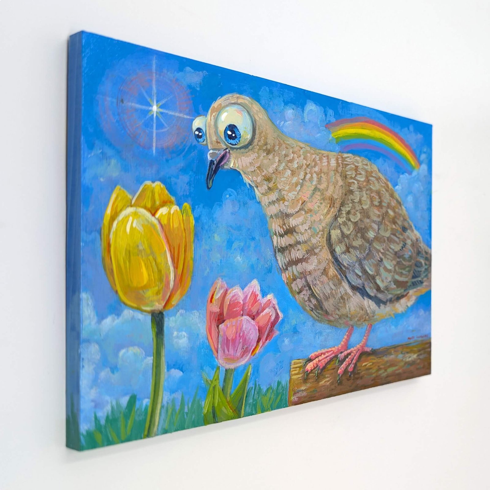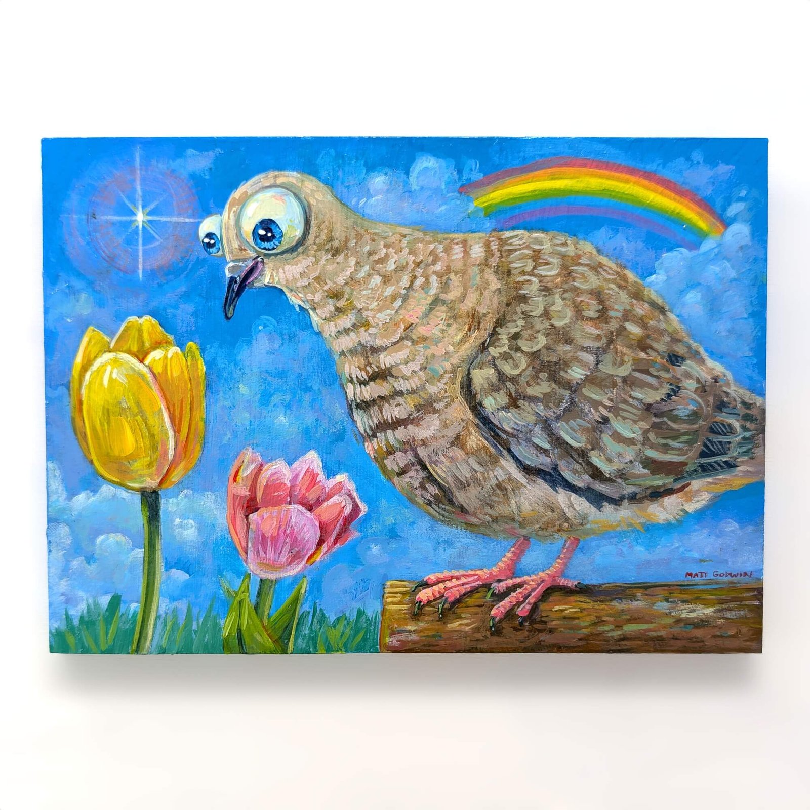 “Sweet Mourning Dove Admiring The Tulips” original acrylic painting on wood by Matt Godwin 7″x5″ Load Listing