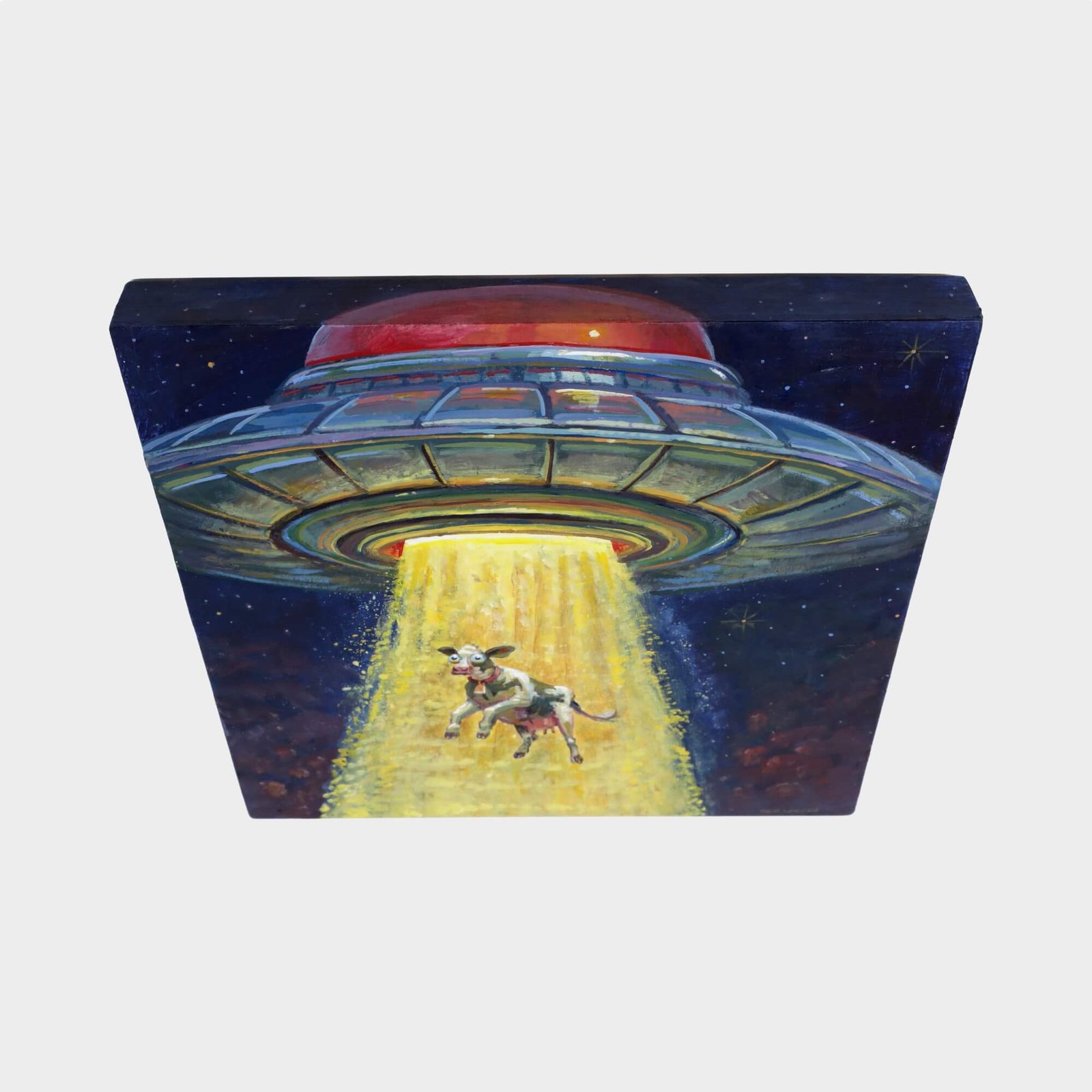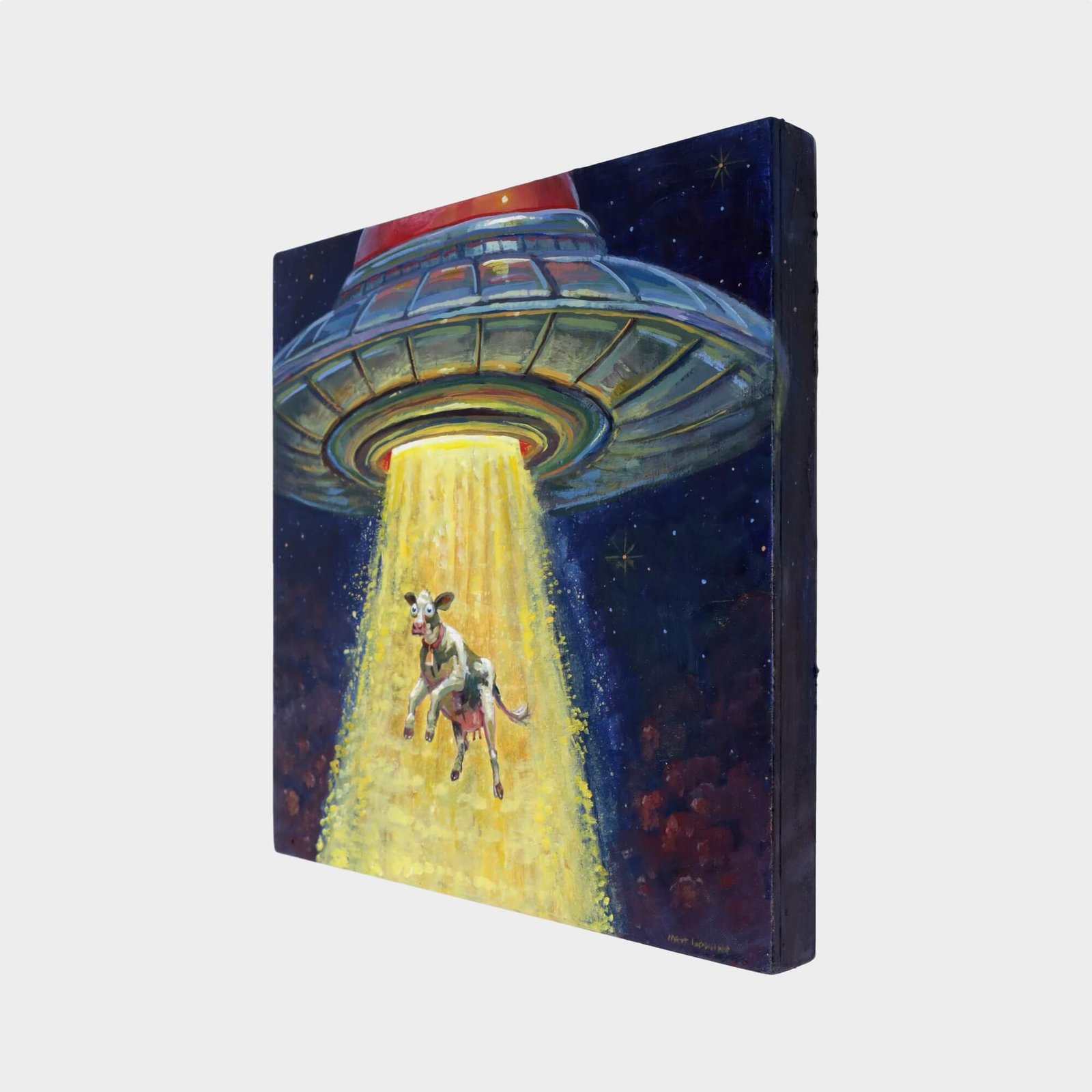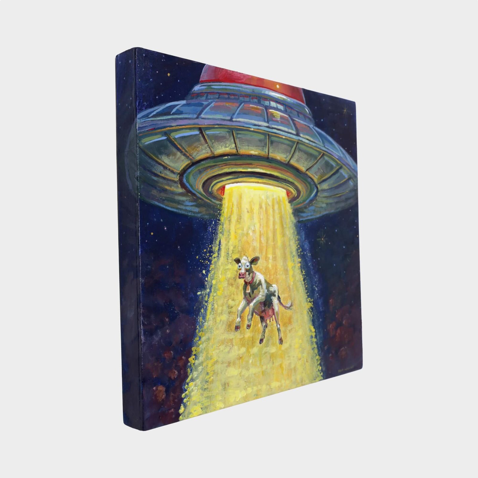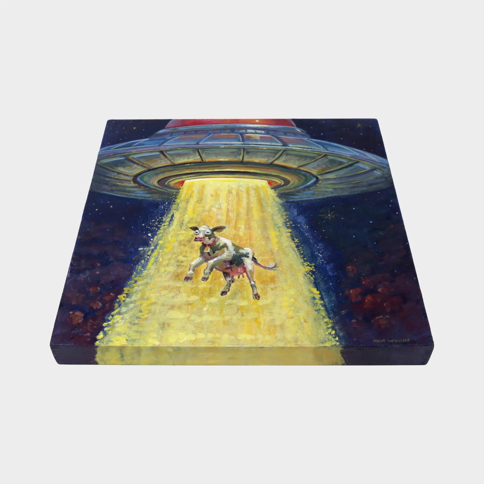 “Ufo Abducting Cow” original acrylic painting on wood by Matt Godwin 8″x8″