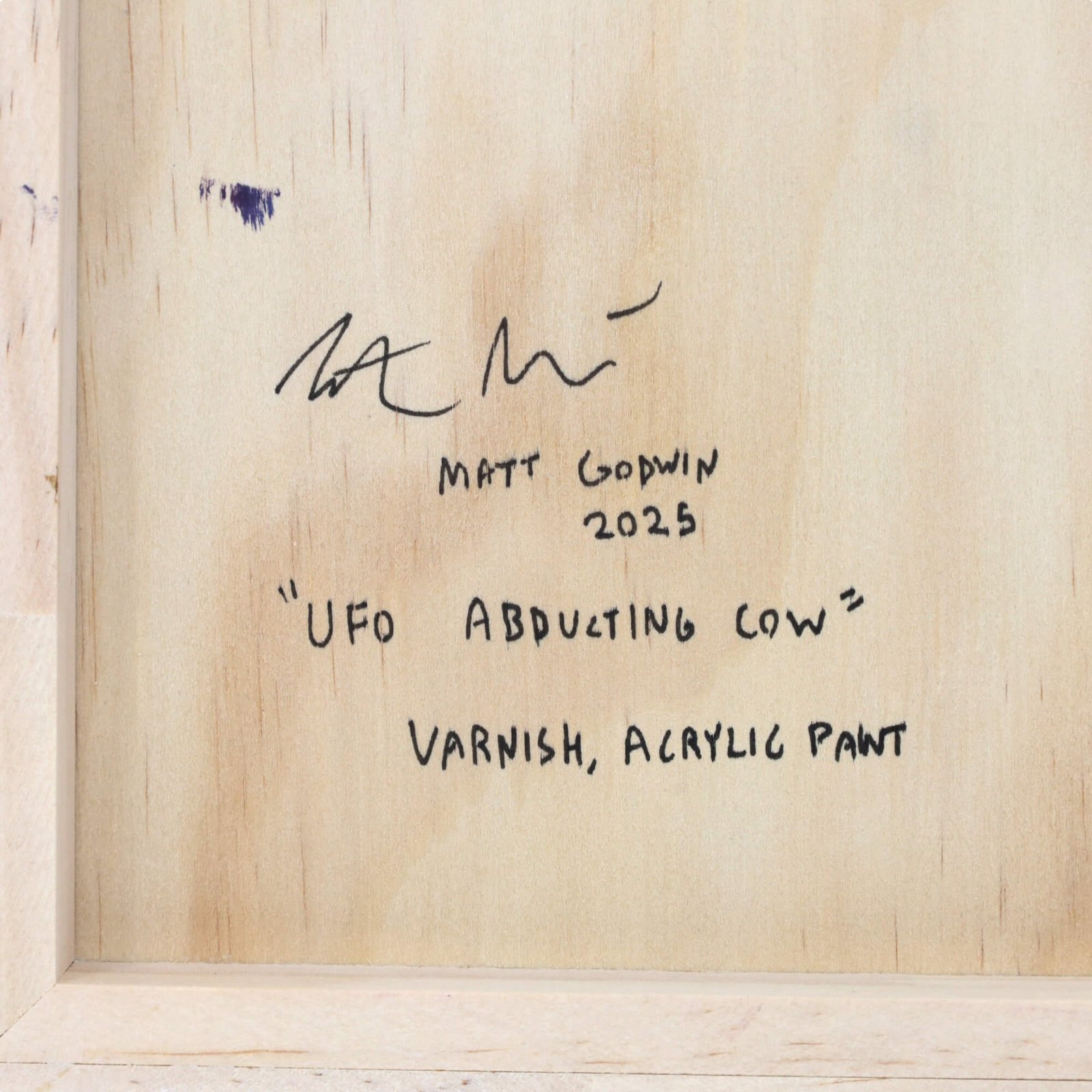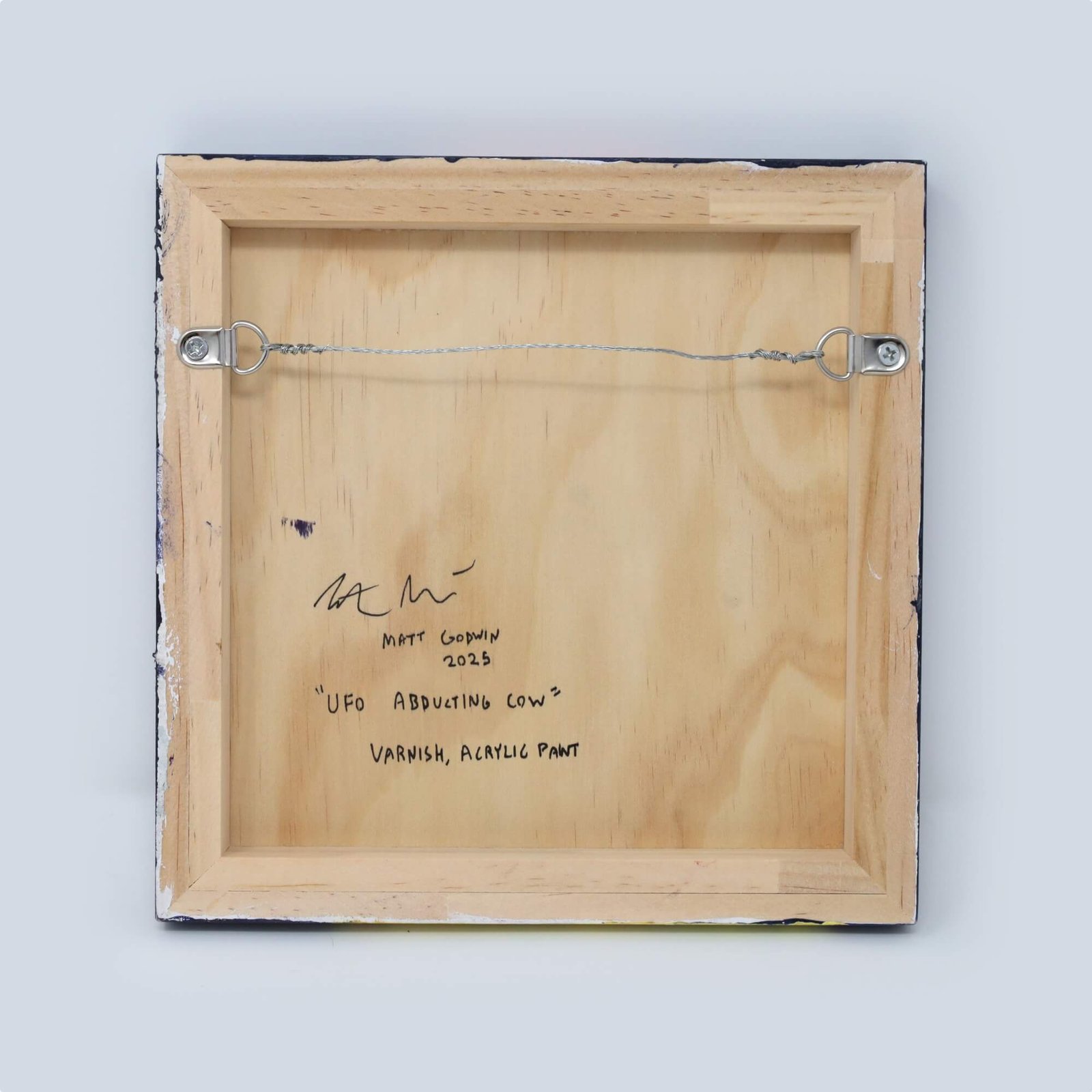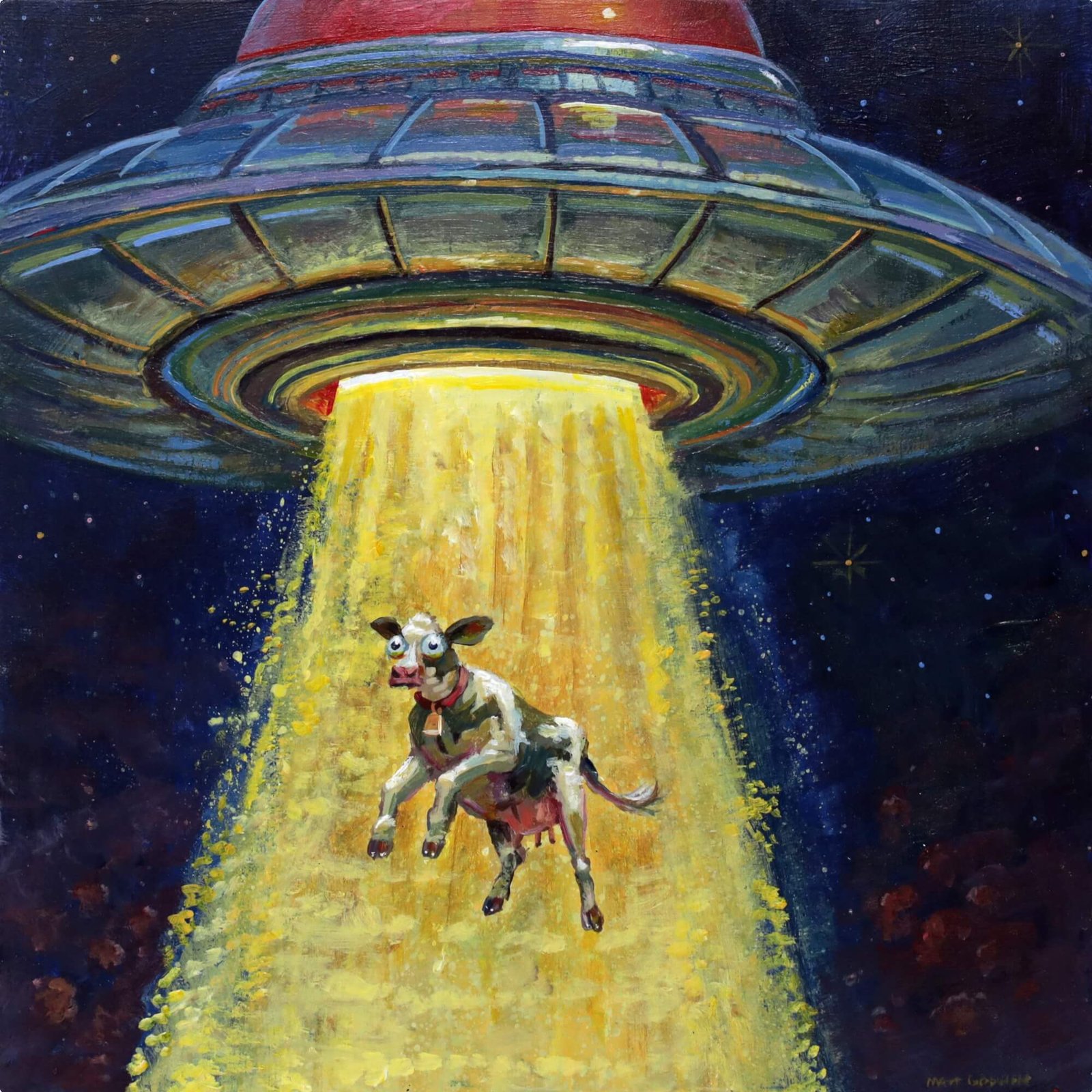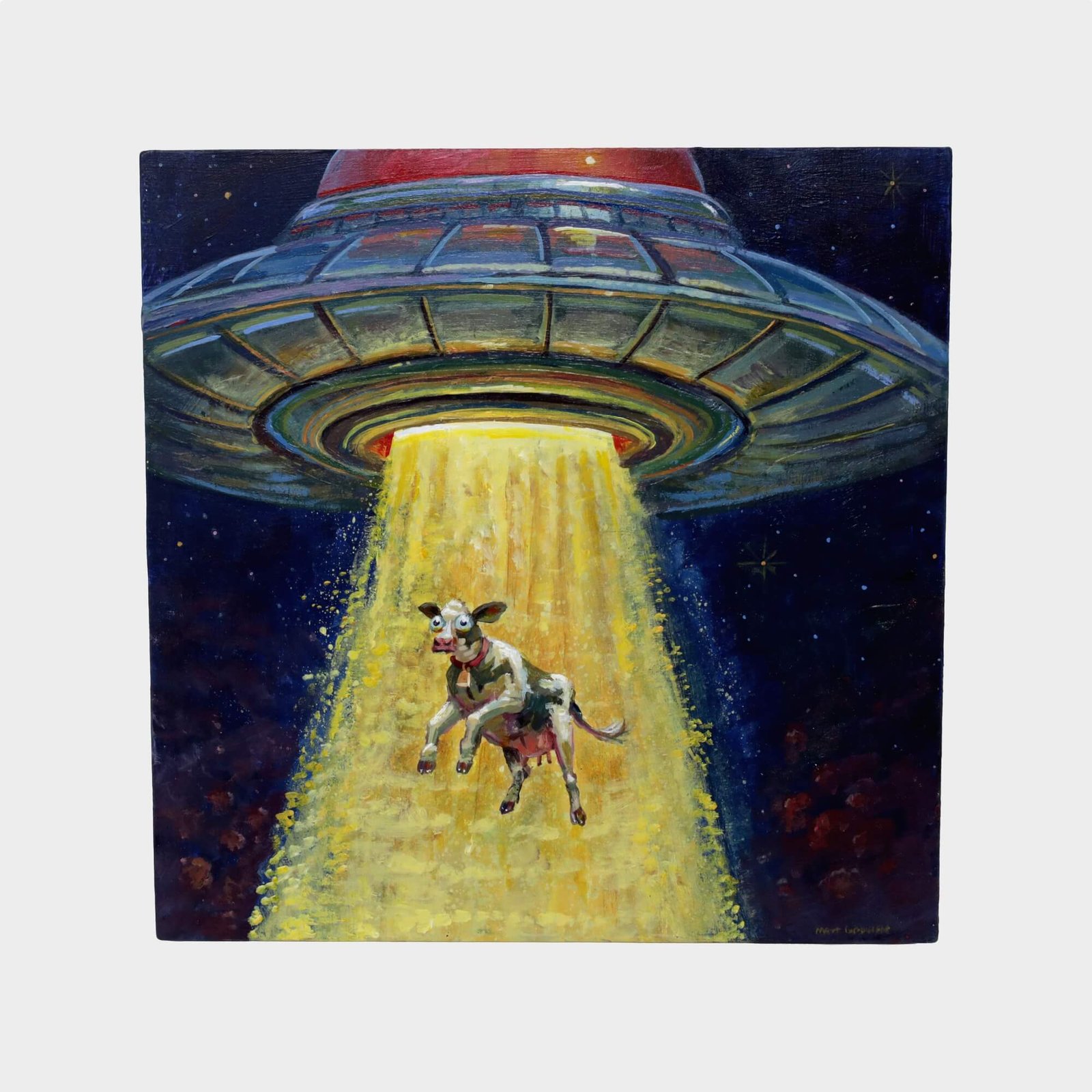 “Ufo Abducting Cow” original acrylic painting on wood by Matt Godwin 8″x8″
