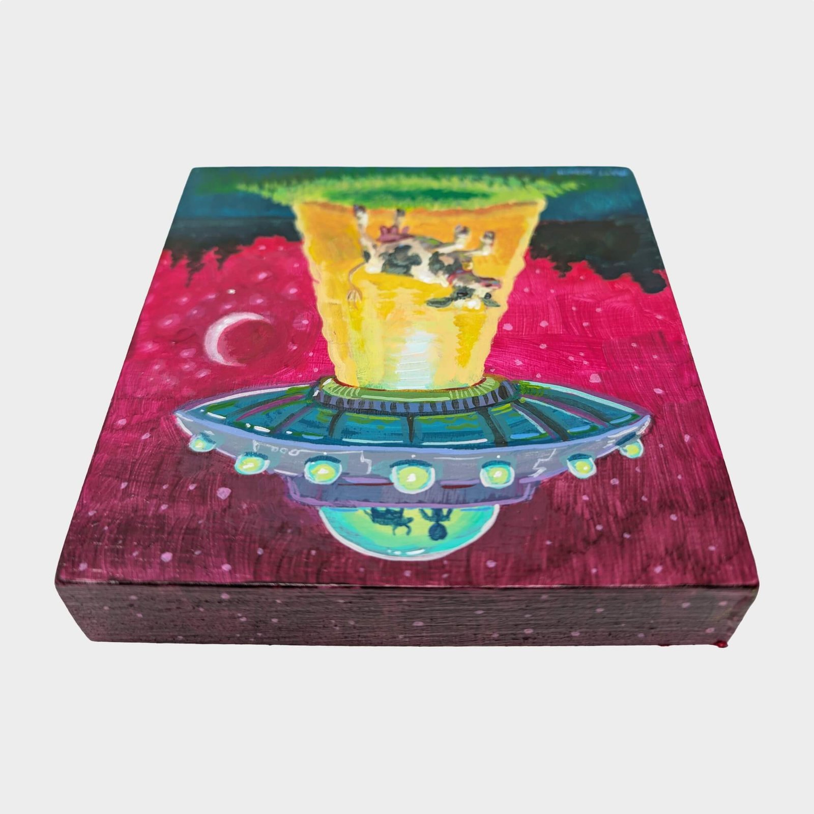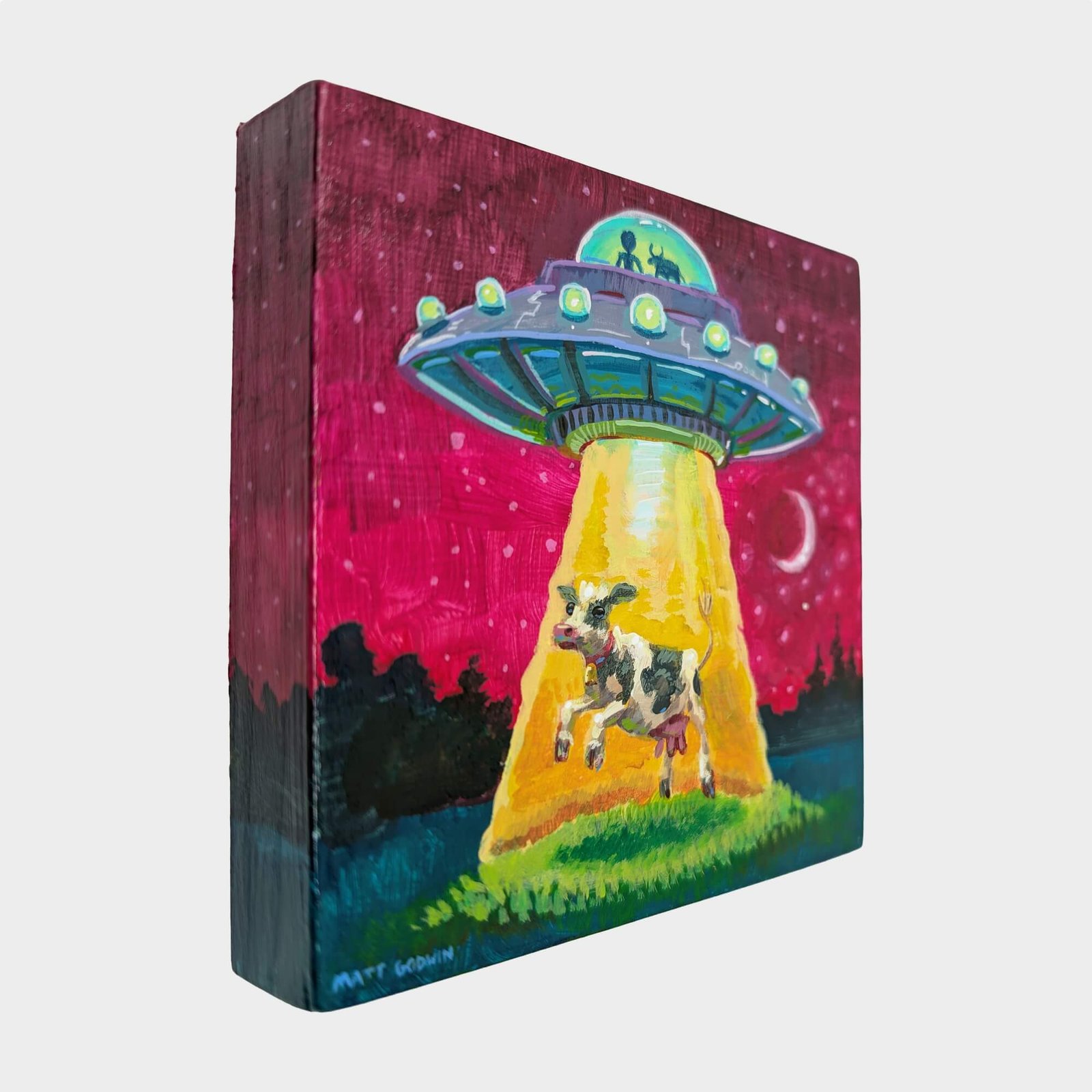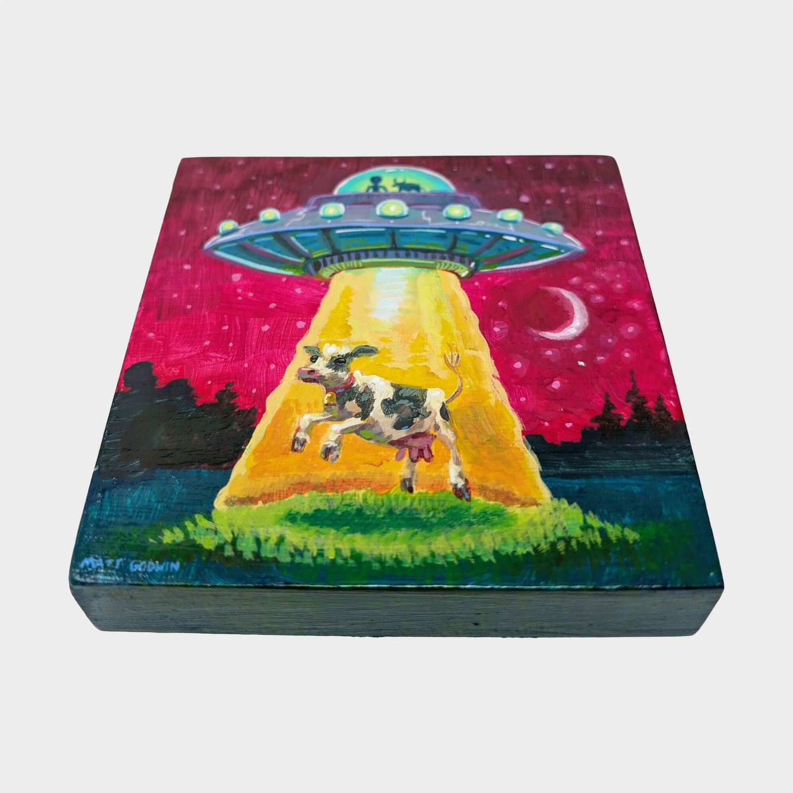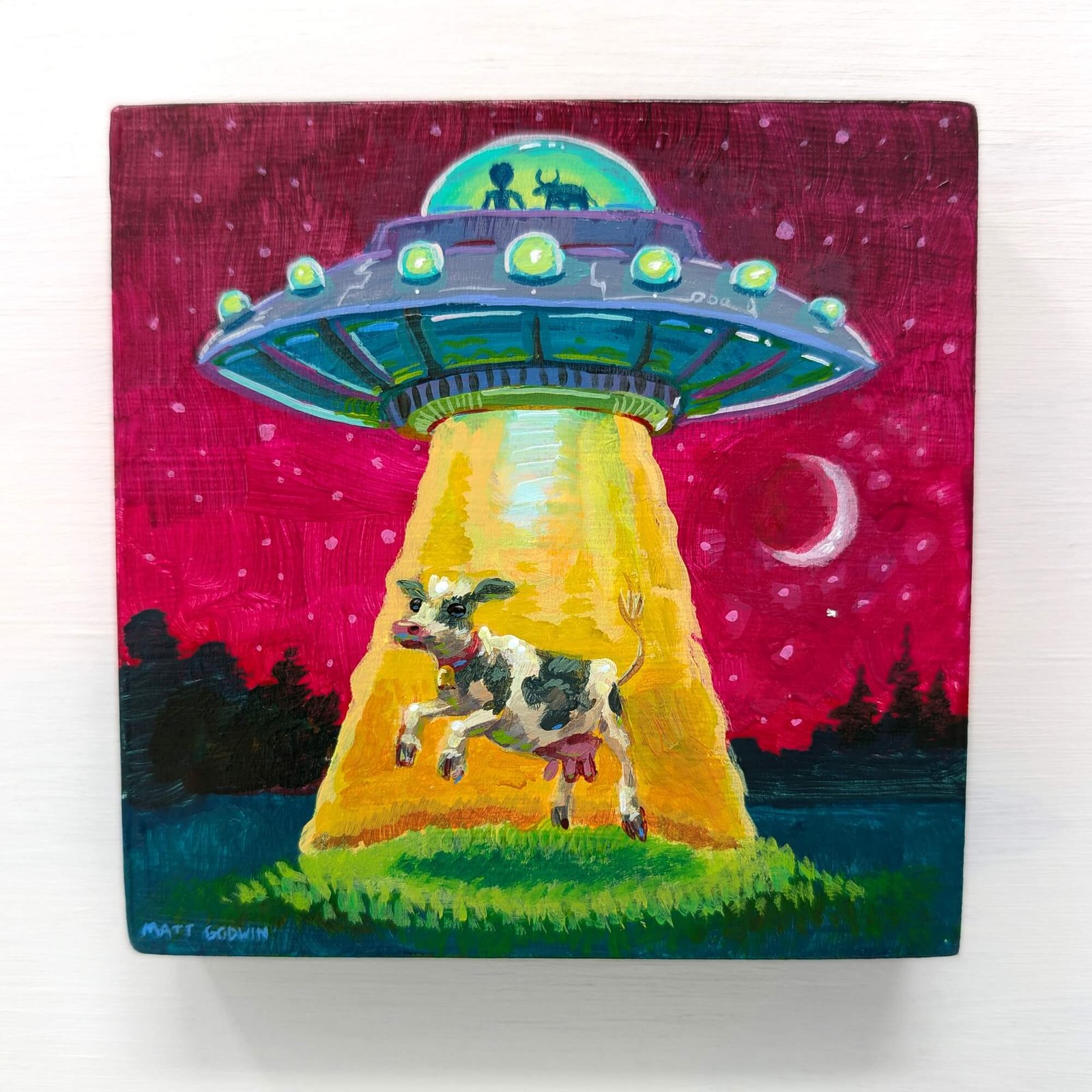 “UFO Cow Abduction” original acrylic painting on wood by Matt Godwin 4″x4″