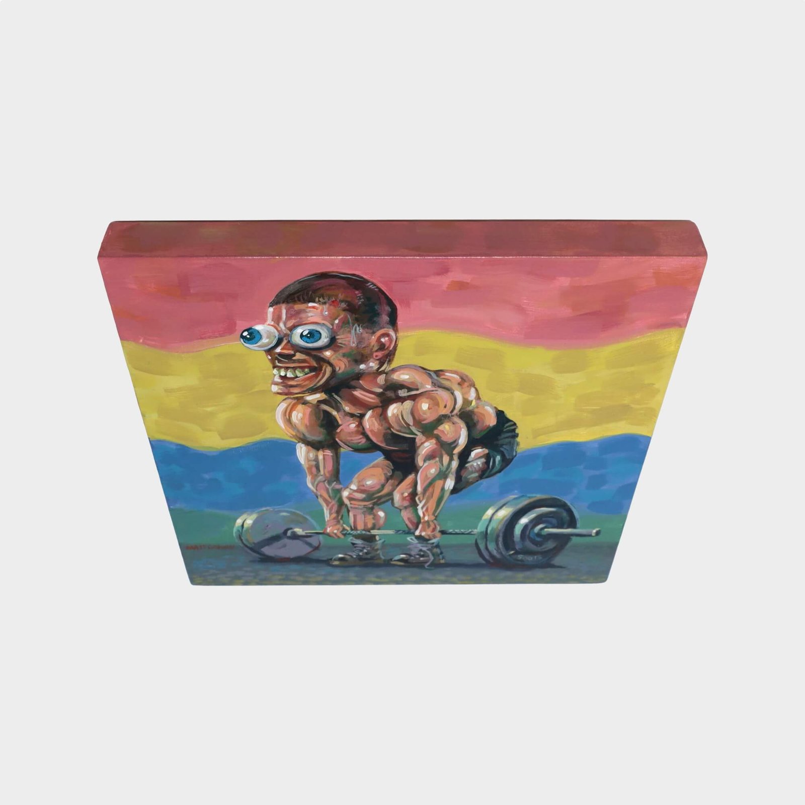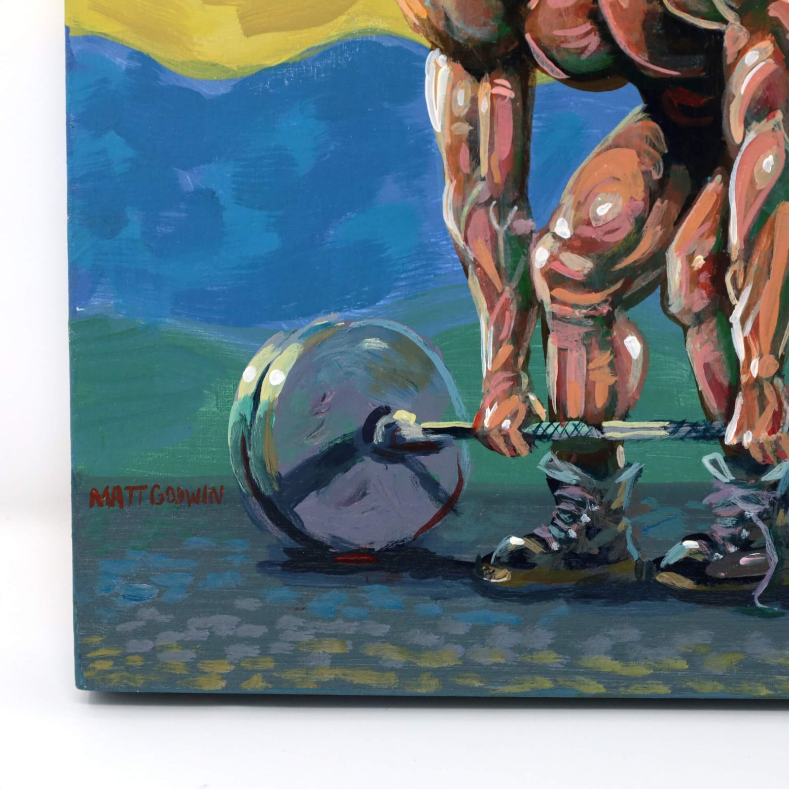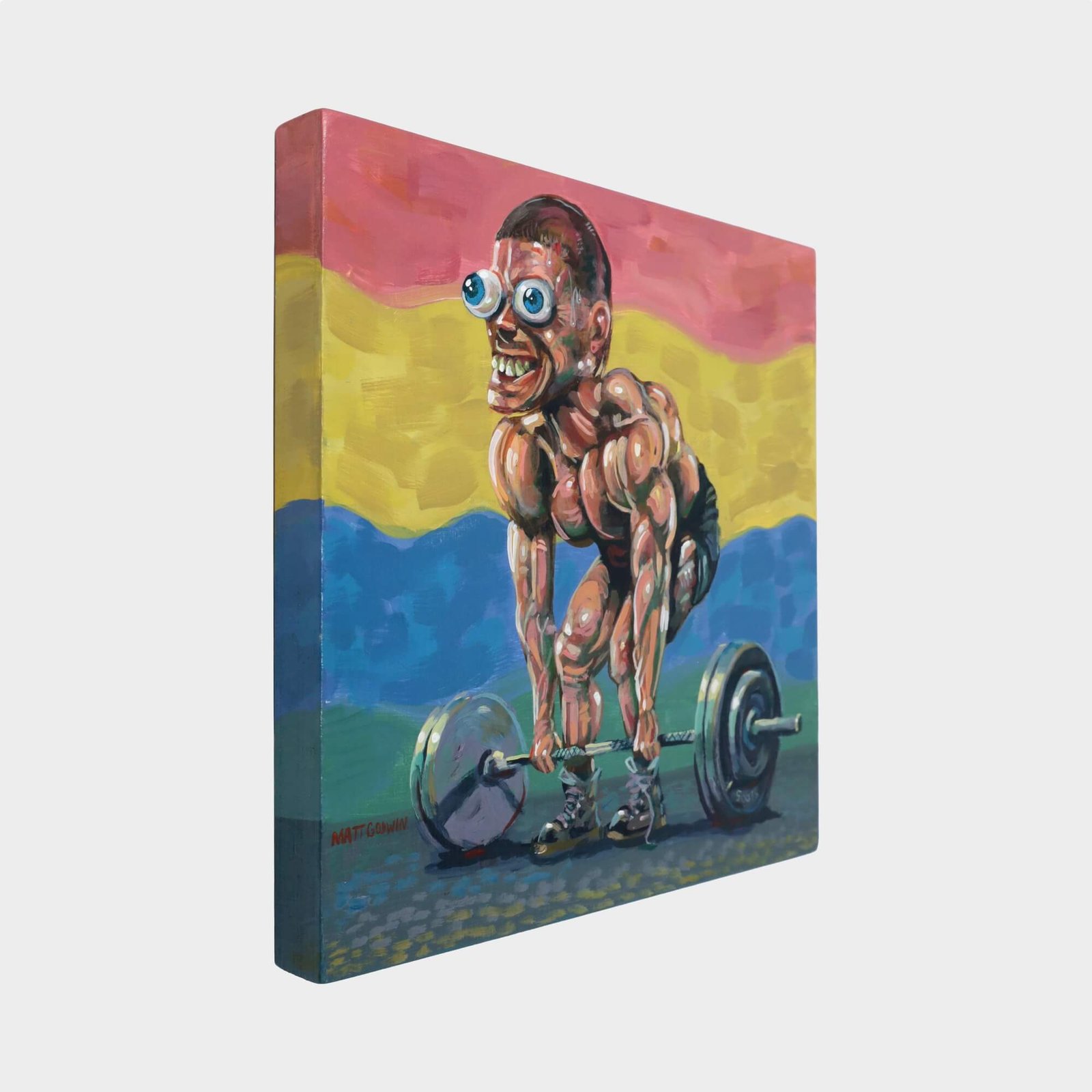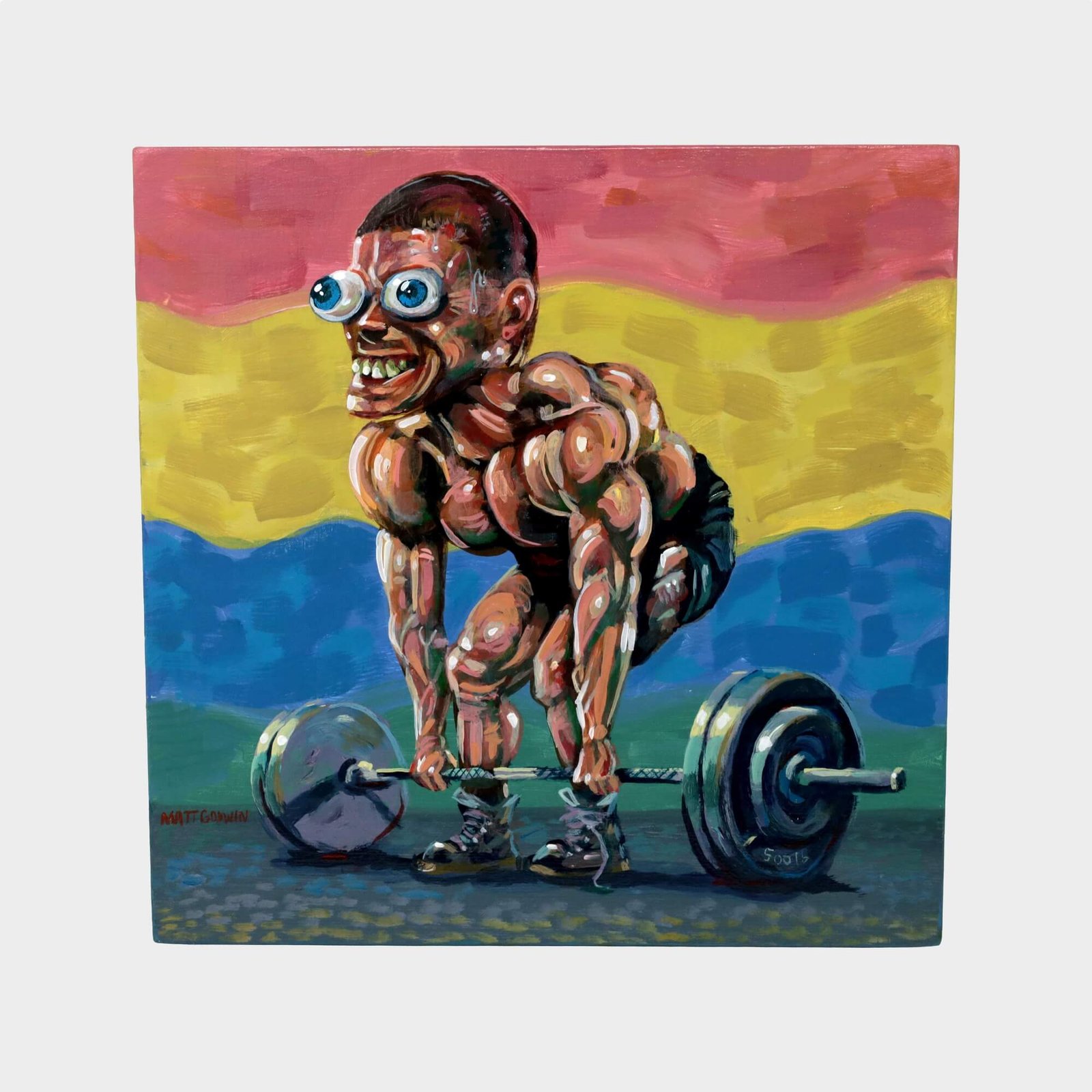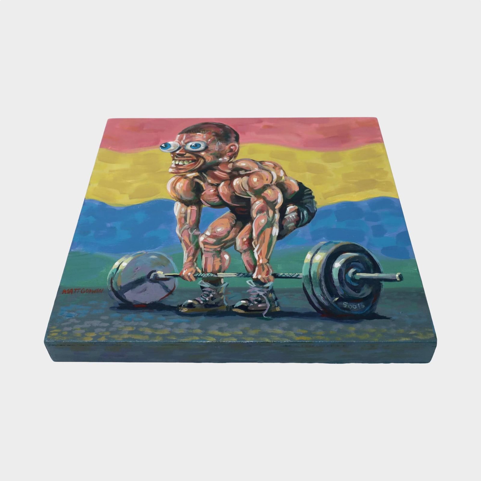 “Weight Lifter” original acrylic painting on wood by Matt Godwin 8″x8″