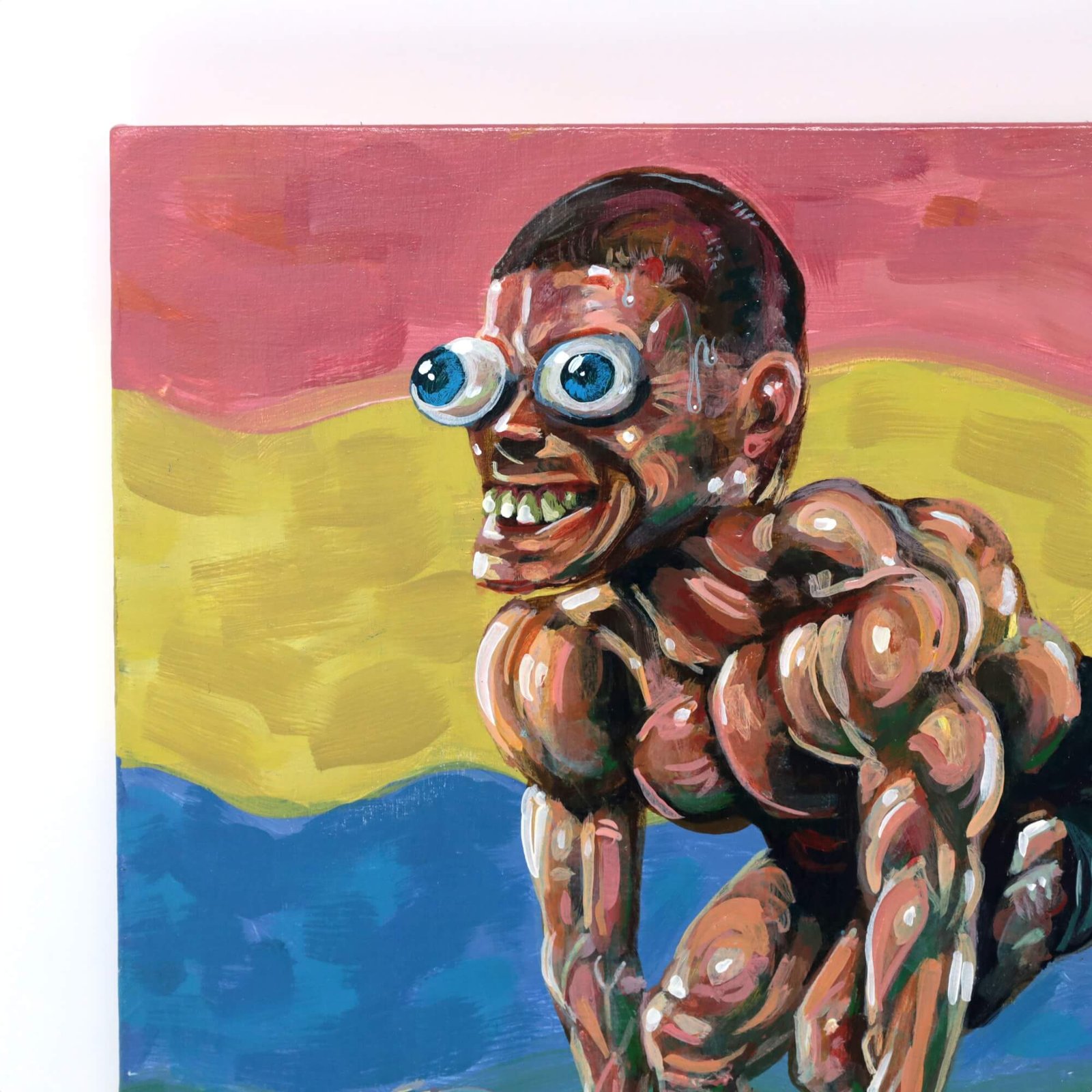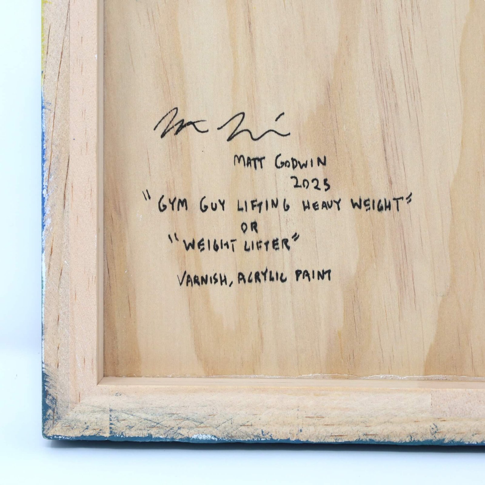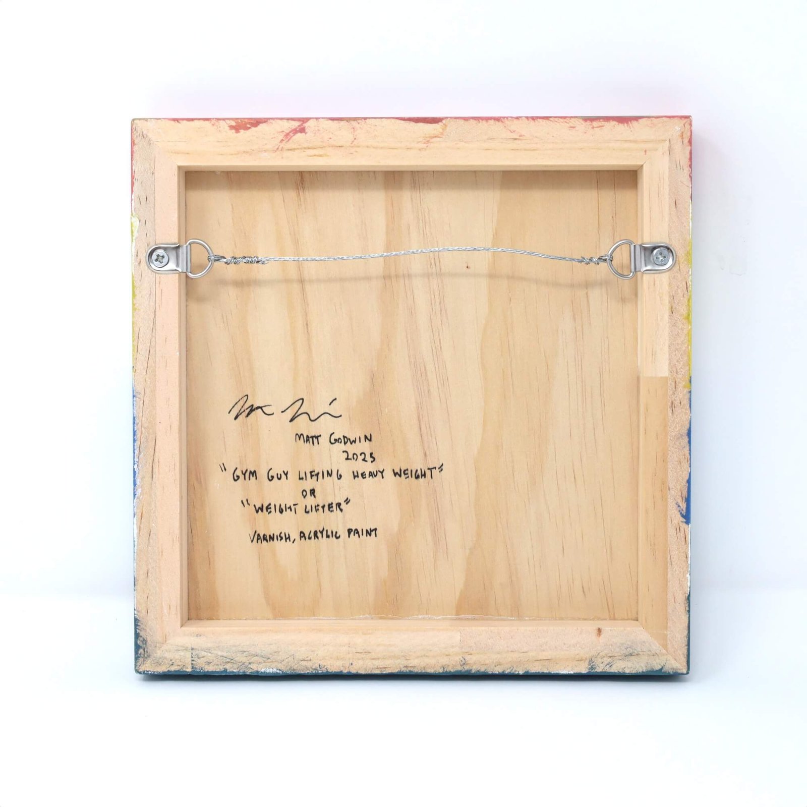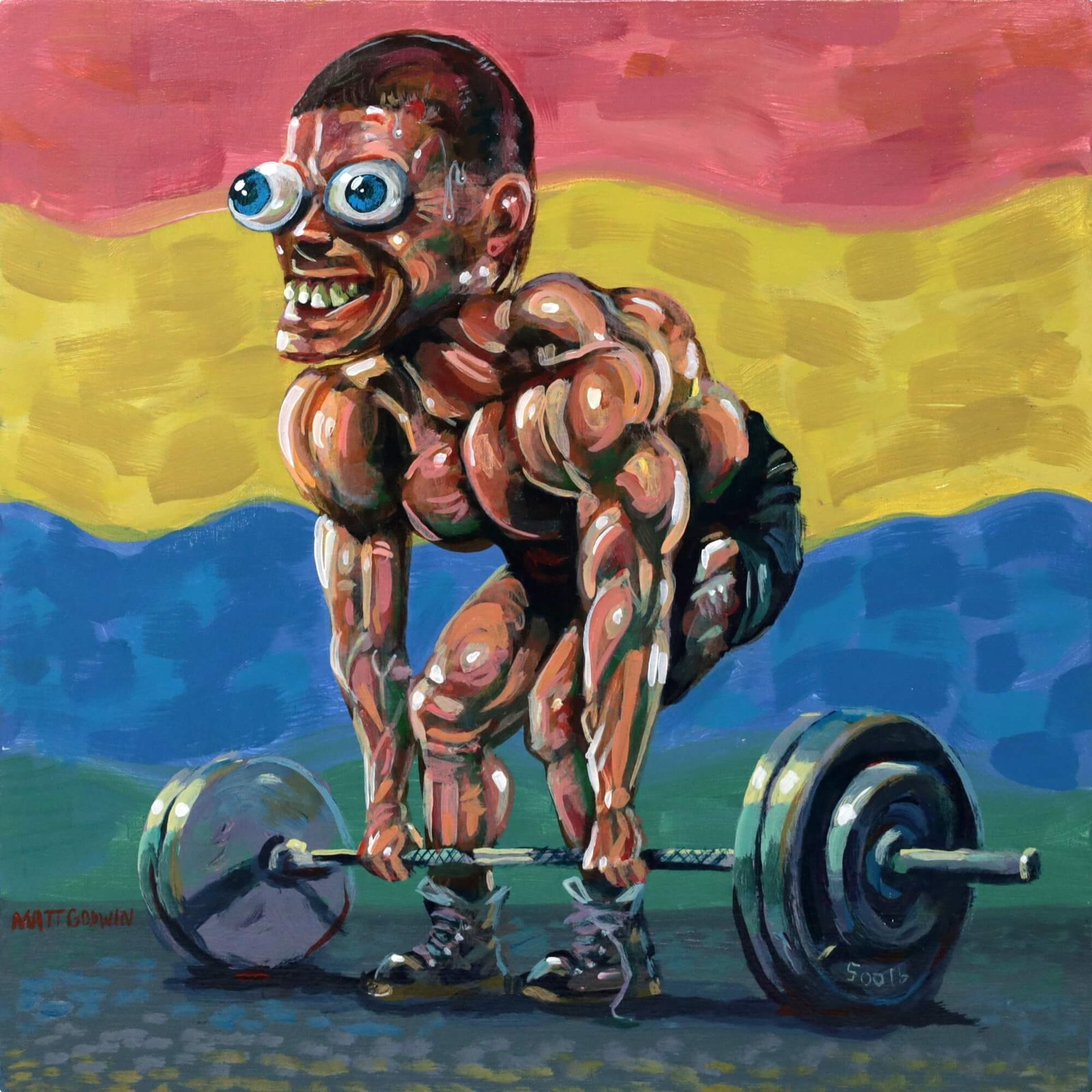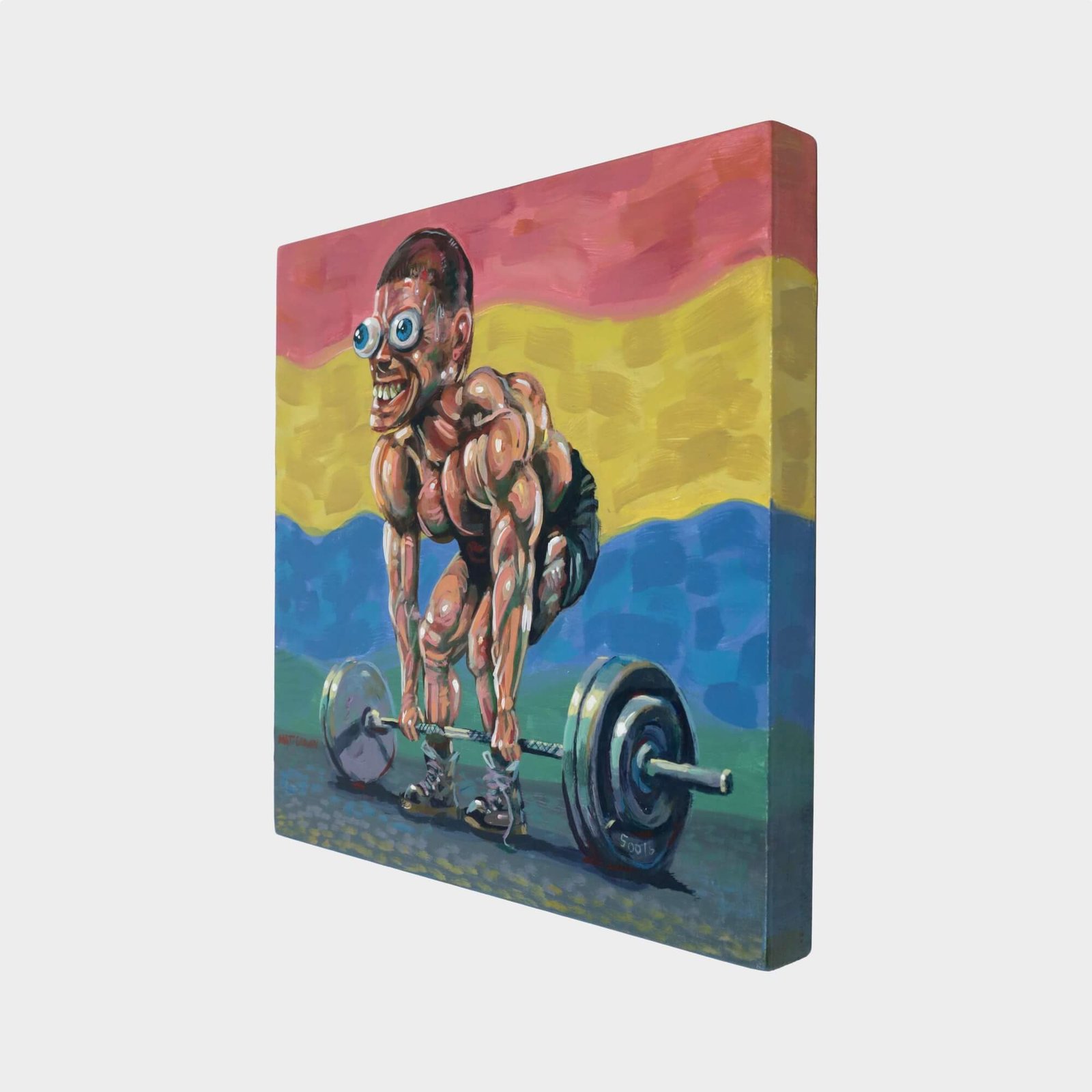 “Weight Lifter” original acrylic painting on wood by Matt Godwin 8″x8″